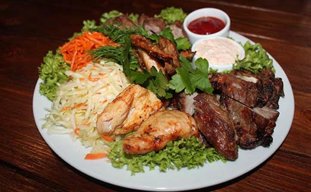 Состав: Салат со свежей капусты - 150 гр Морковь по-корейски - 100 гр Шашлык из шеи - 200 гр Шашлык из ребра - 200 гр Крыло куриное (2 шт) -150 гр Ш-к из куриного филе (2 кус.) - 150 гр Соус фирменный (1 порция) - 30 гр Соус белый (1 порция) - 50 гр Укроп - 10 гр Петрушка - 10 гр Салат свежий - 10 гр Лук зелёный - 25 гр |