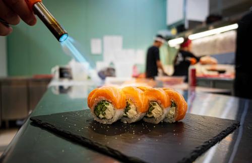 Идзуми татаки тай маки – окунь, свит чили, яблоко, сыр сливочный, кунжут, рис, нори.