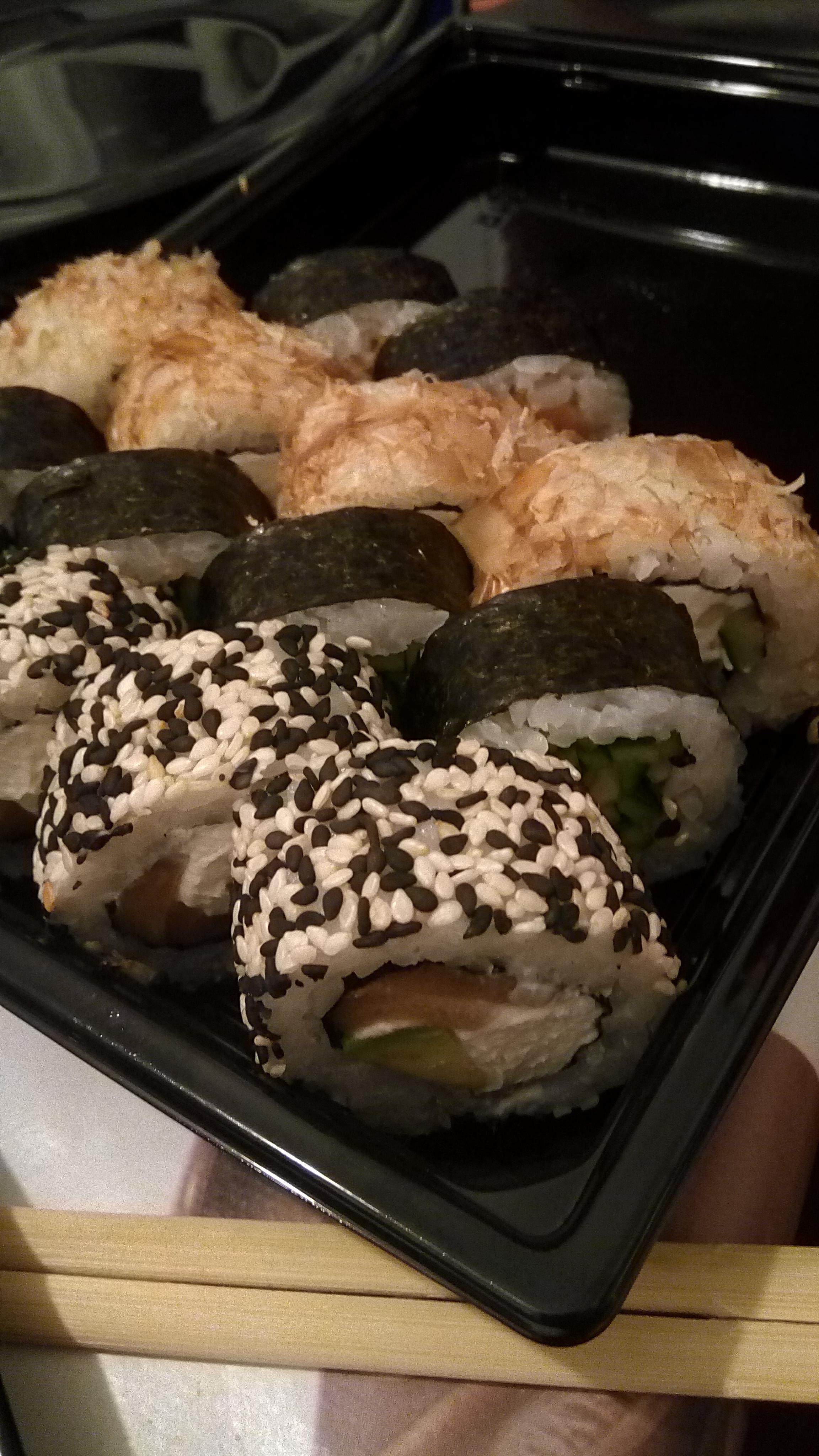 Вкусные суши, в сете "Филадельфия" много сыра, достаточно лосося. Единственный минус: при доставке оплата производится только наличными курьеру. Через терминал заказывала бы намного чаще
