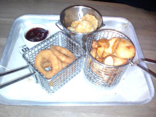 Состав: куриные крылышки в кисло-сладком соусе, луковые кольца, куриные наггетсы, сырные палочки из сыра Моцарелла, бастурма из говядины, фисташки, крендельки с солью. Подаются с аджикой и фирменным соусом