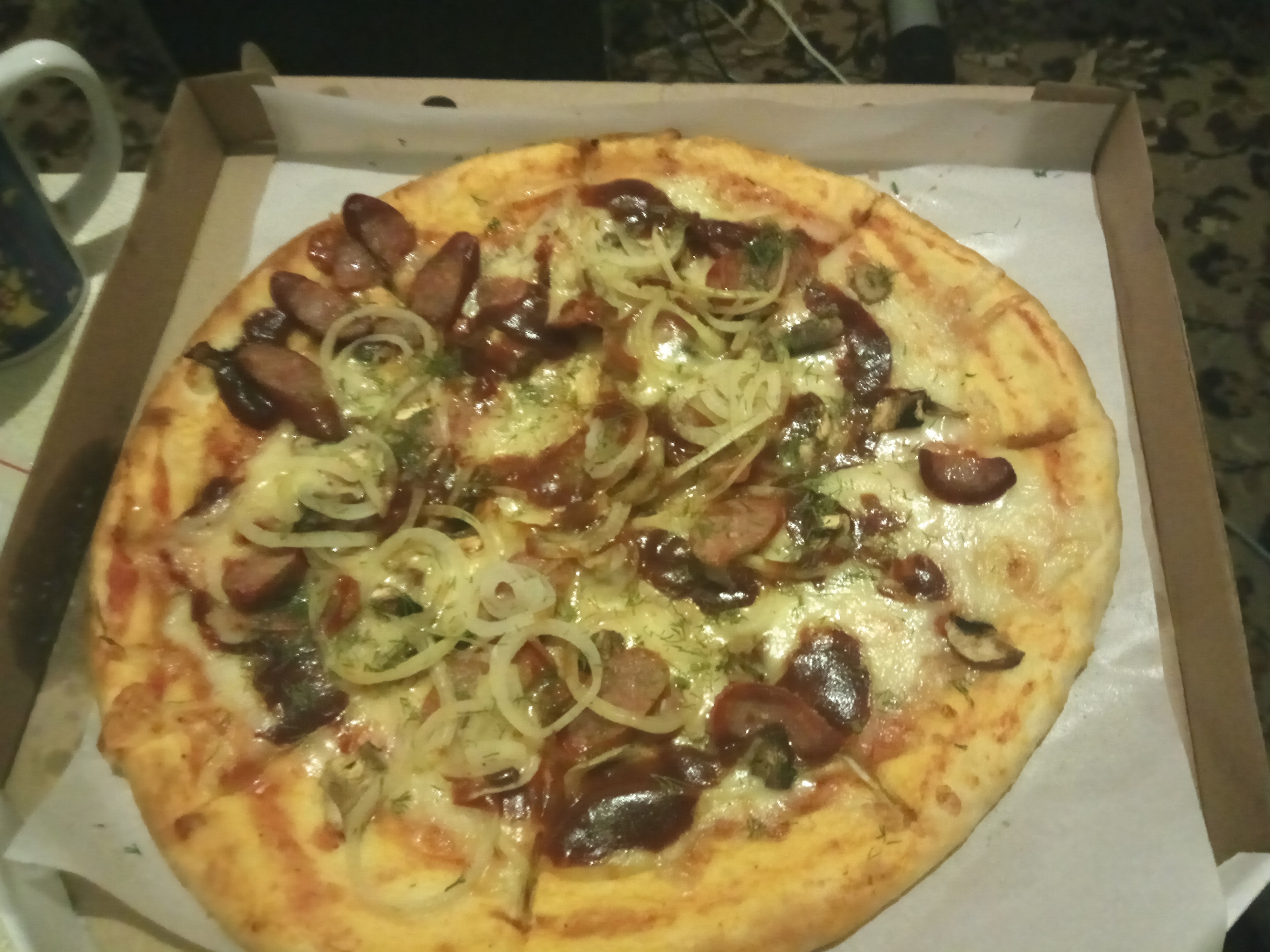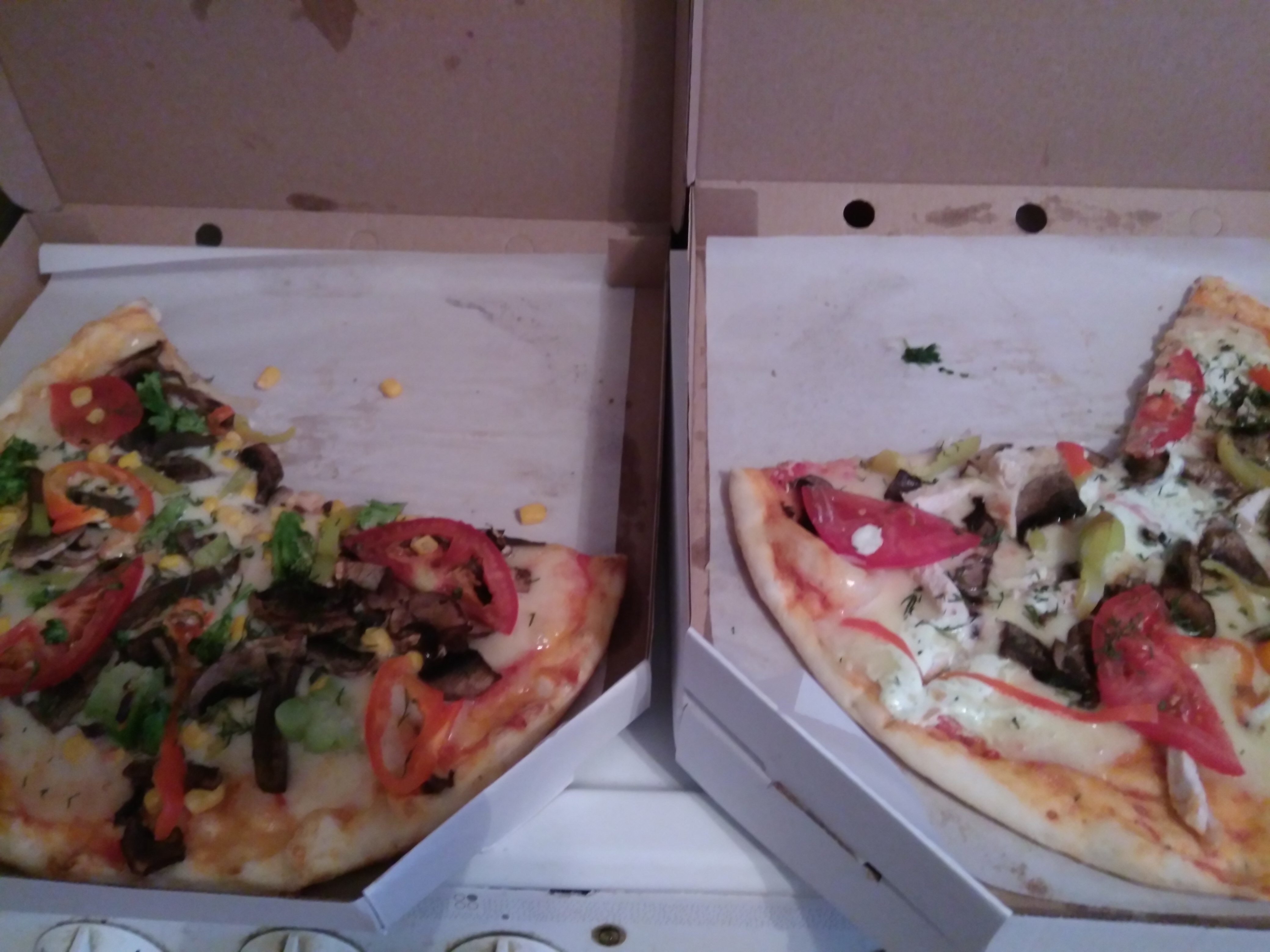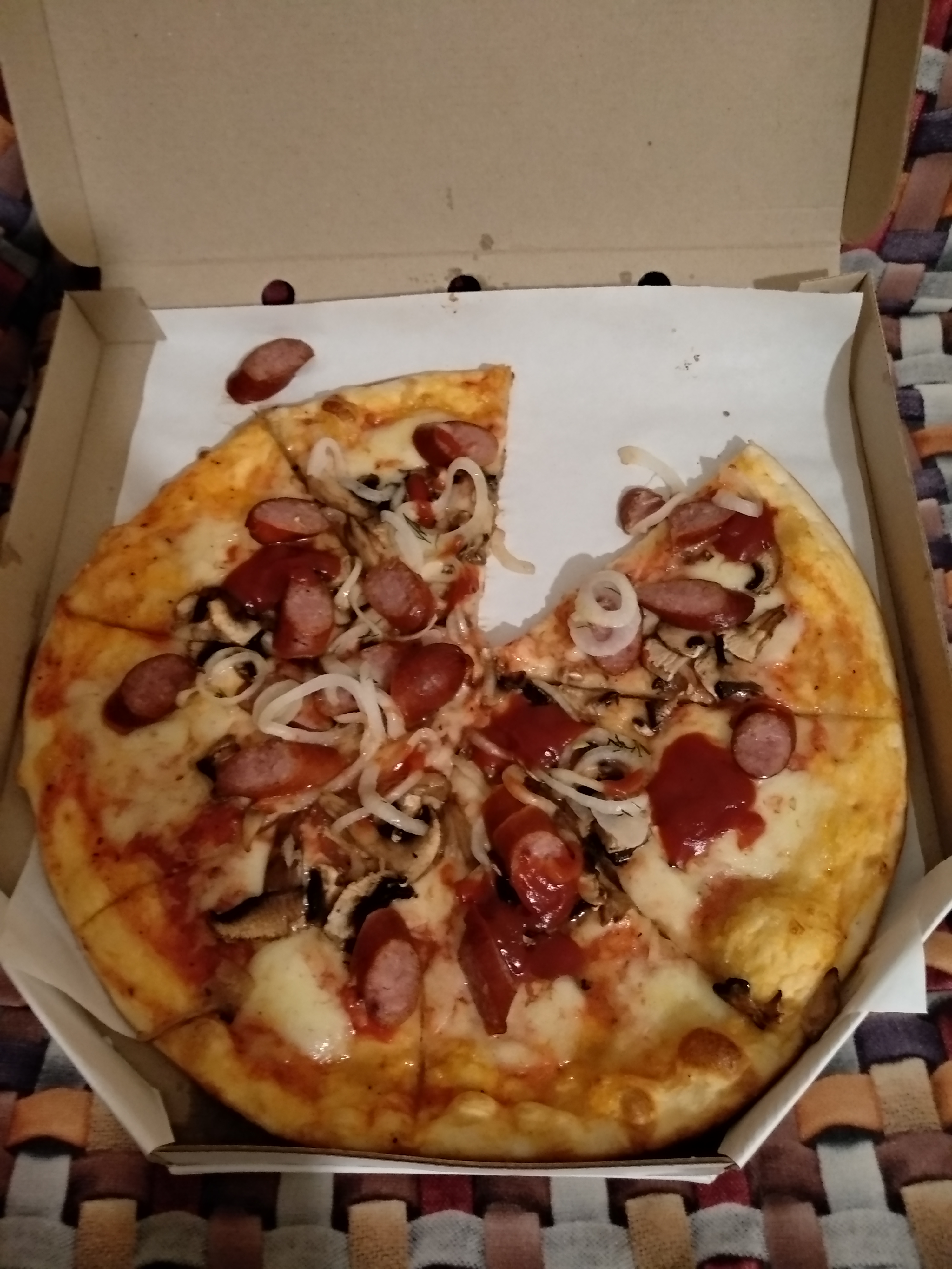 По итогу приезжает курьер, начинает извиняться с порога и информирует нас о том, что одна порция борща разлилась, деньги за эту порцию не взял. "Не беда", - подумали мы, вытирая остальные контейнеры салфетками. Курьер уехал. Открываем пиццу, а она с луком! После беседы с оператором, нам пообщали привезти другую пиццу, соответствующую нашему заказу. Приехал курьер через мин 20, пиццу обменяли.