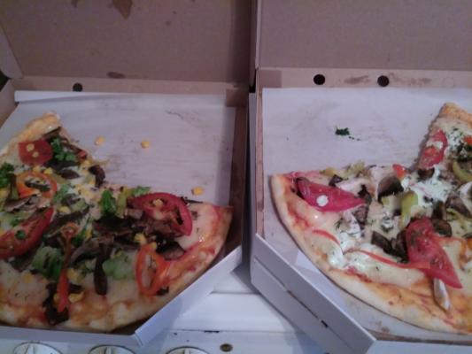 Заказывала 2 пиццы (с тунцом и вегетарианскую) с самовывозом, за всё отдала 12 руб. Пиццы вкусные, пока донесла до дома ещё были тёплые, плюсую