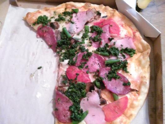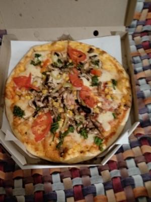 Заказали пиццу вегетарианскую.  Вроде бы ничего,  но не хватает насыщенности во вкусе. Привезли вовремя.  Пицца тёплая.
