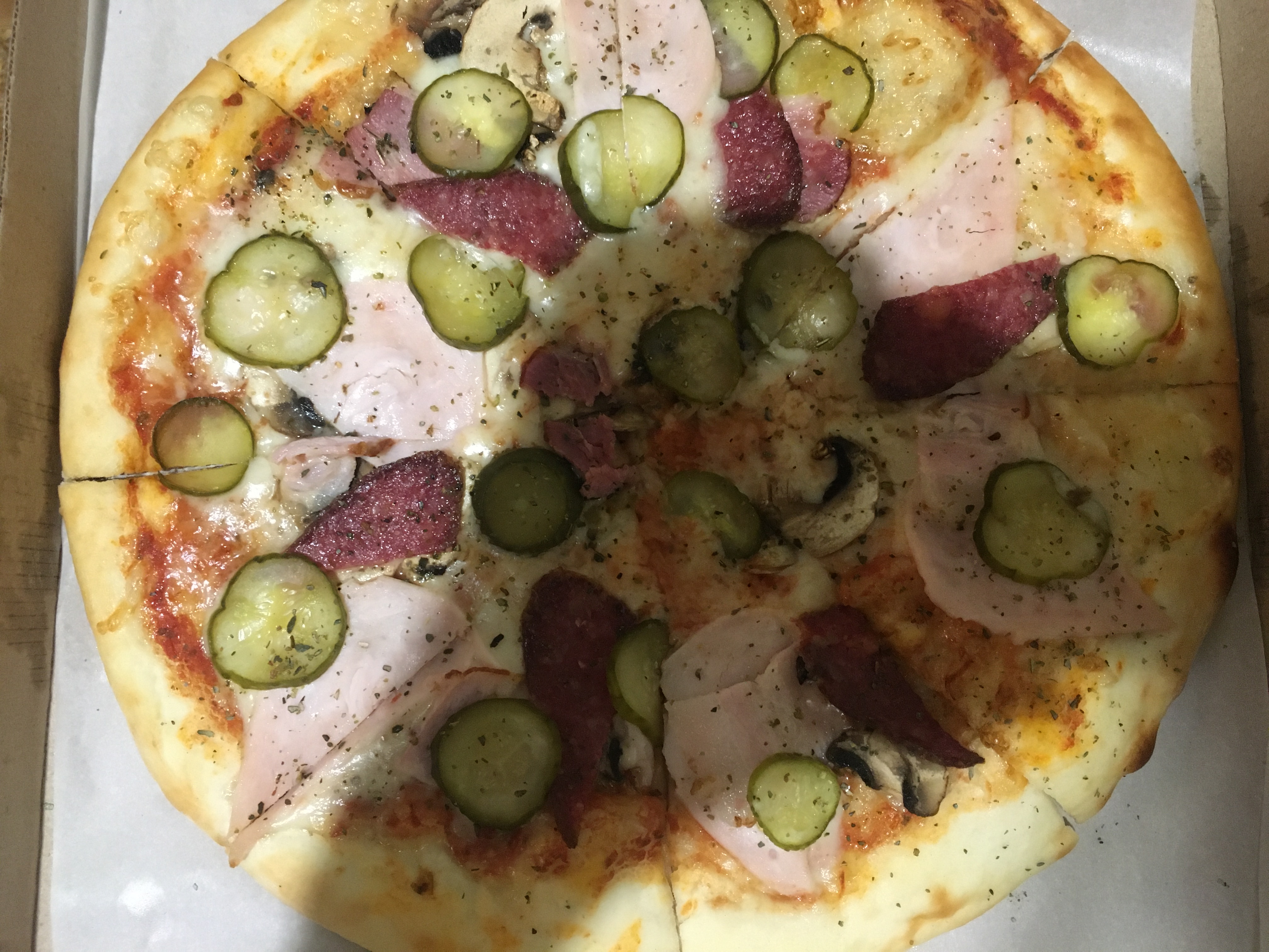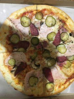Состав: тесто дрожжевое, соус для пиццы, сыр моцарелла,  филей в/к, грудинка к/з, колбаса с/к, шампиньоны свежие, огурец маринованный, зелень