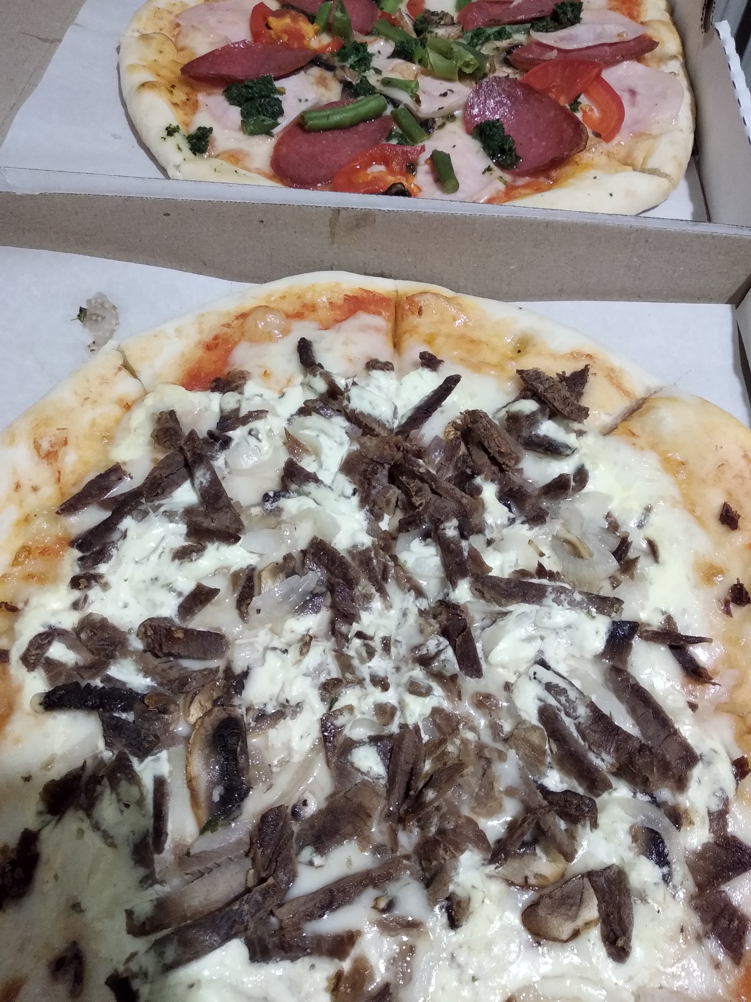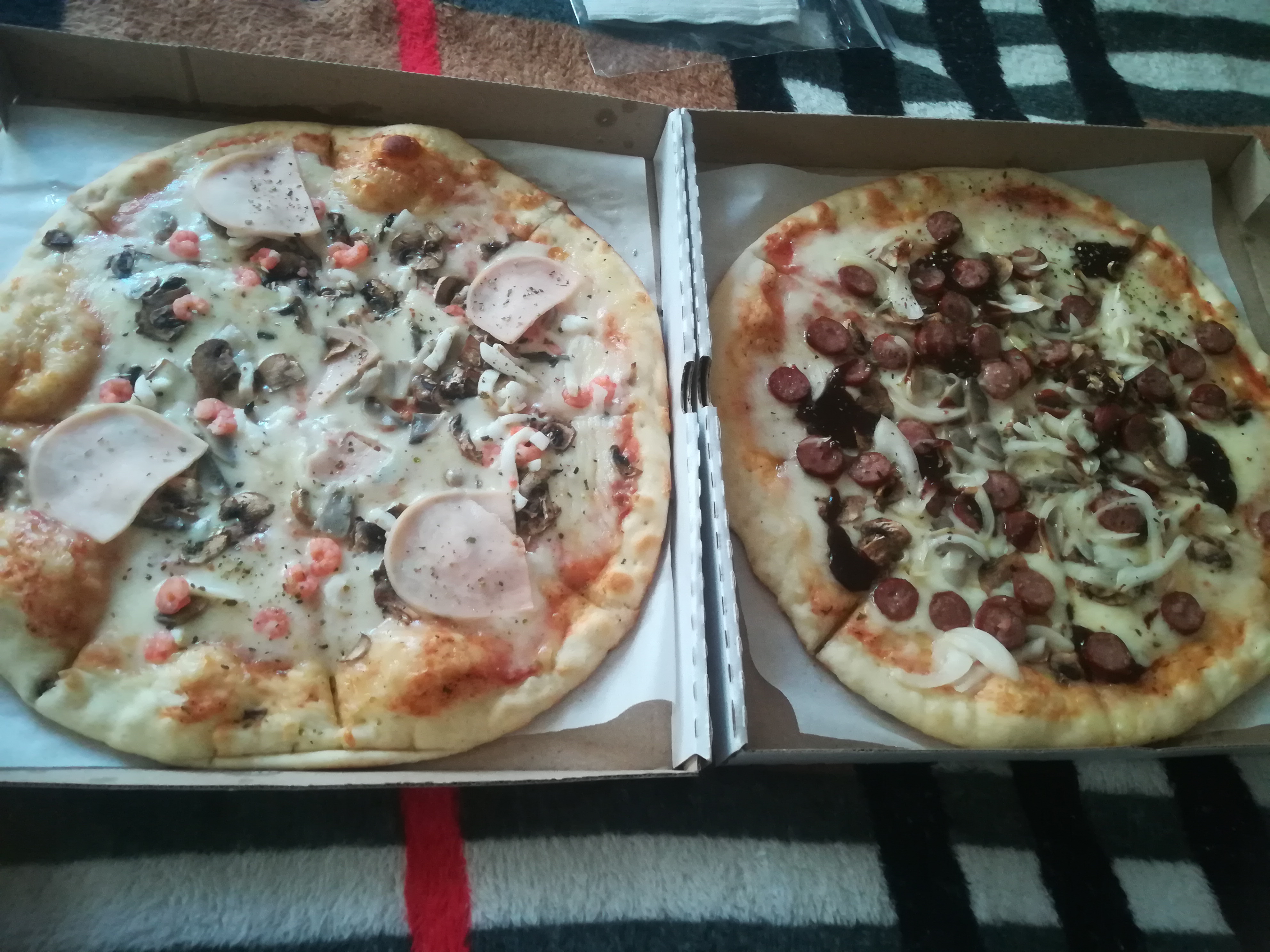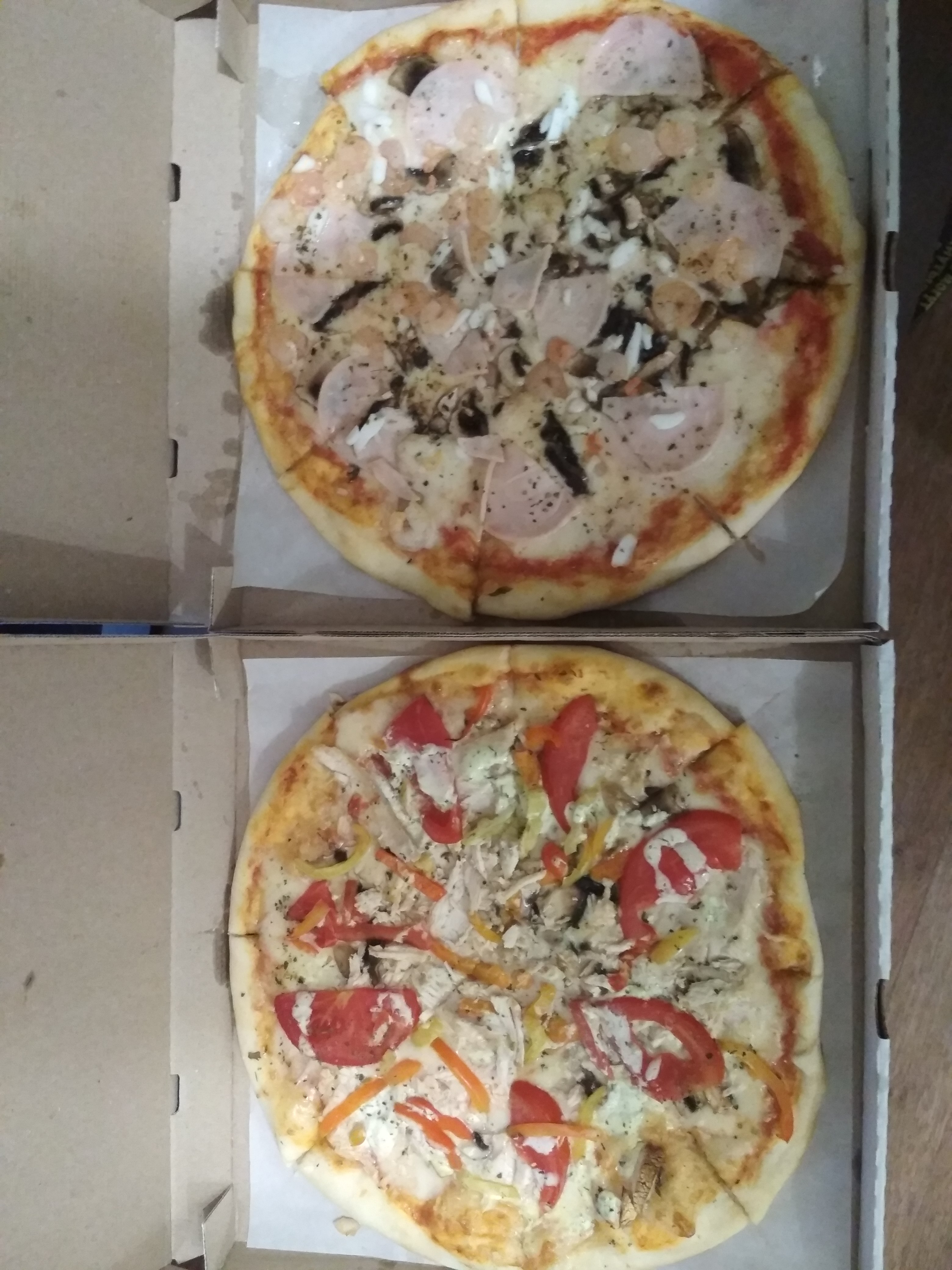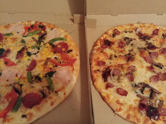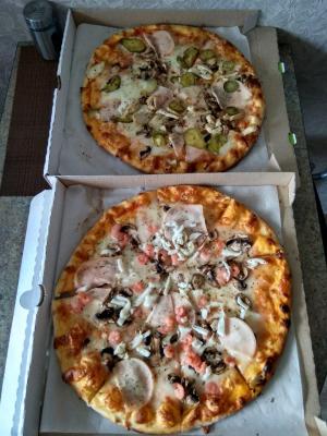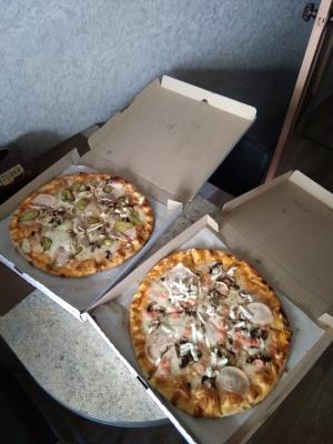 Пиццы Очень Вкусные!!!Привезли вовремя,как и обещали,горяченькие,все в хорошем виде.Тесто по краю пышное,напоминает чесночные булочки,а посередине,где начинка - в меру: и не толстое и не тонкое)Ели с Удовольствием!Очень сытные и ароматные!Бесплатная доставка,
