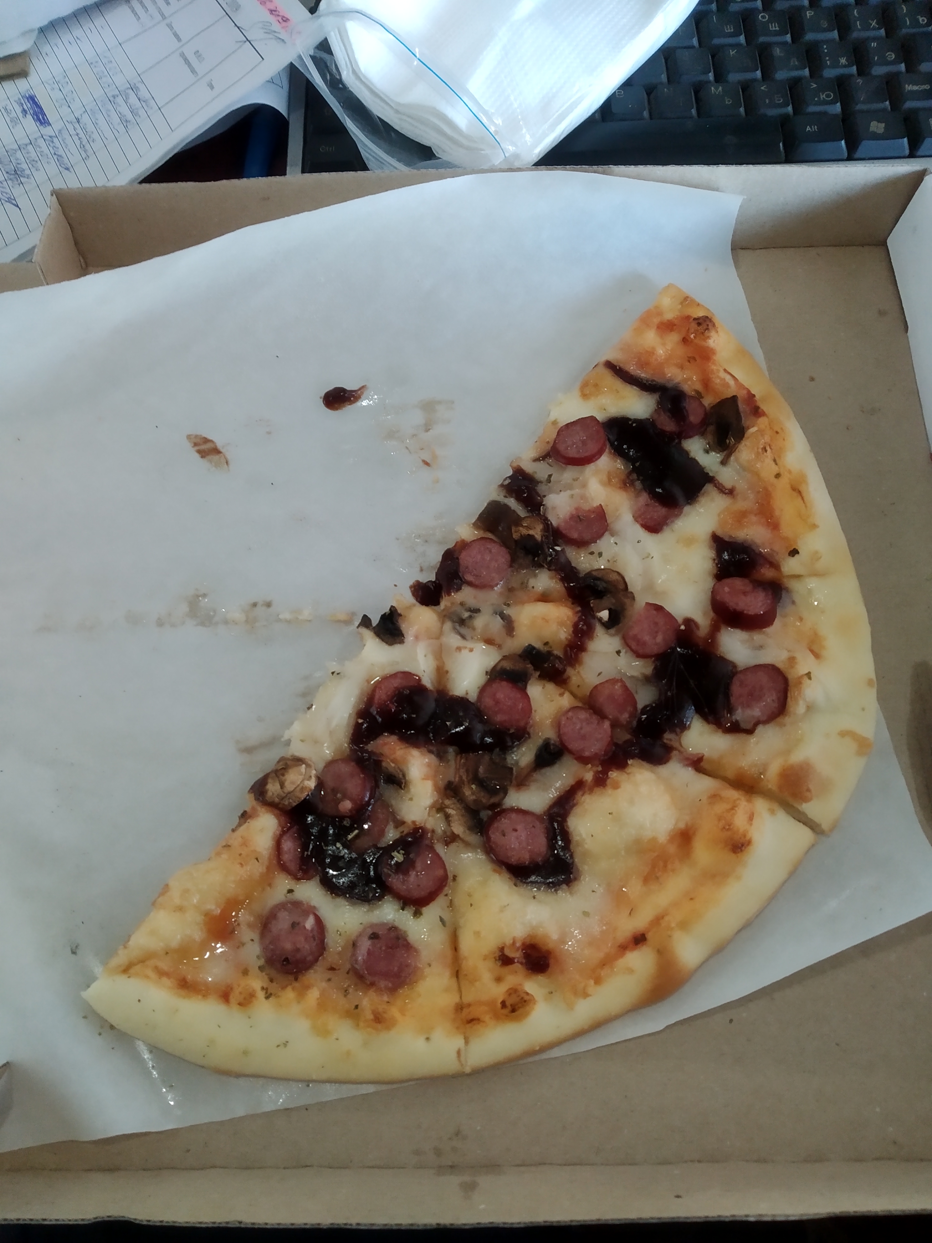 Доставка пиццы заняла 1:40, все тёплое, вкусное, но как уже многие писали много непропечённой муки