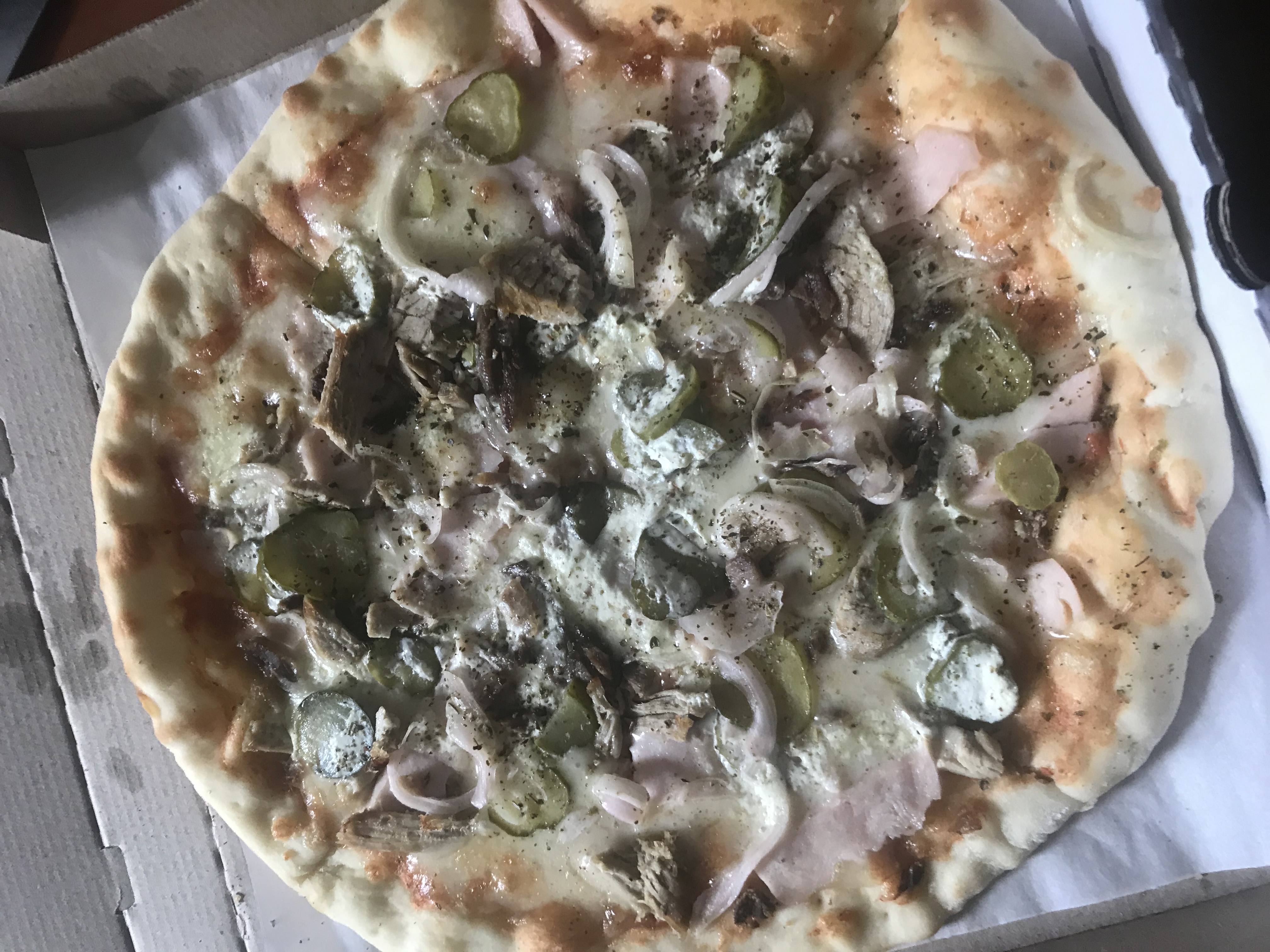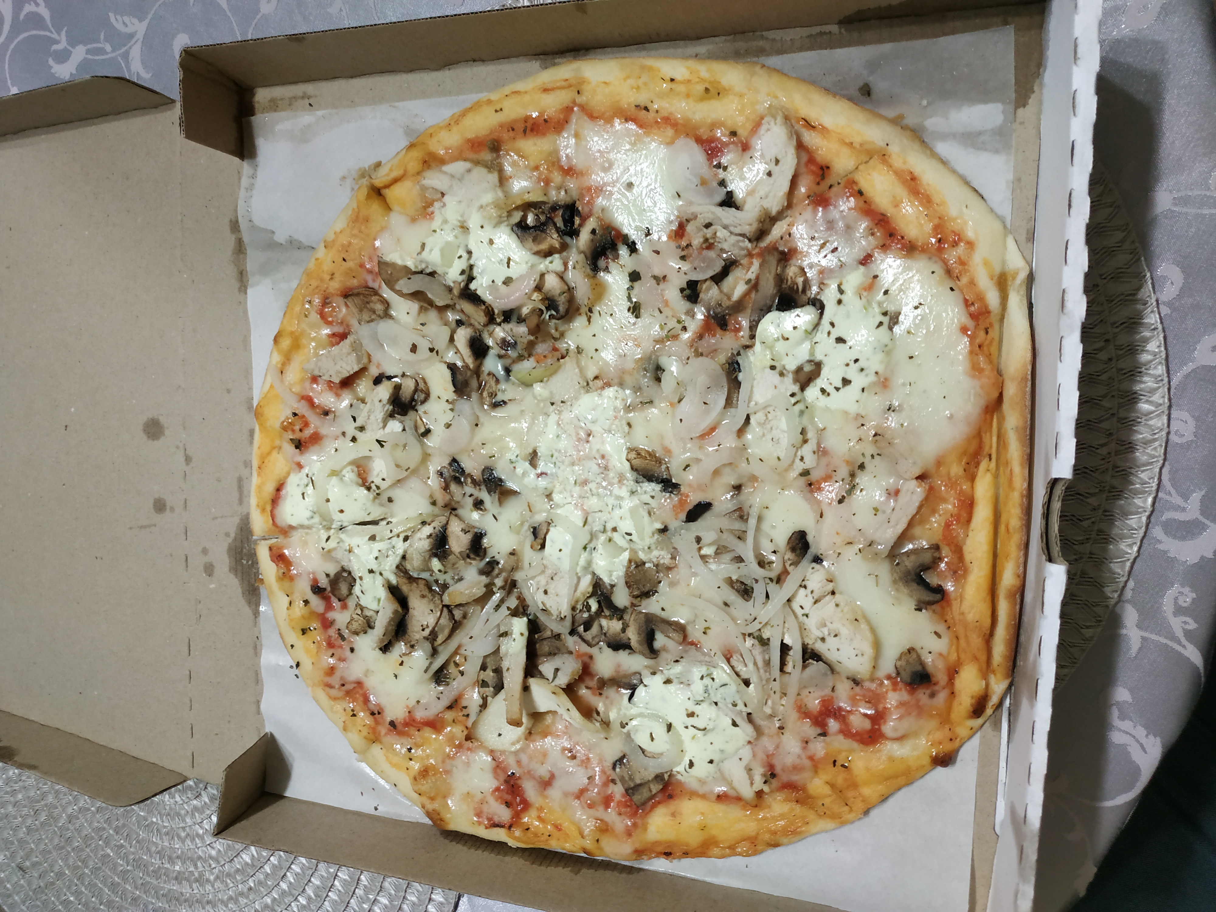Состав: тесто для пиццы, сыр моцарелла, соус для пиццы, филе куриное, шампиньон свежий, филей в/к, огурец маринованный, соус соевый, маслины, оливки, зелень