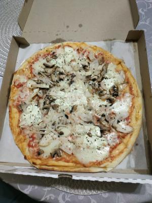 Отличная пицца, много сыра как мы любим. Хотелось бы чуть больше поджарить тесто. Вкусна горячая и холодная.