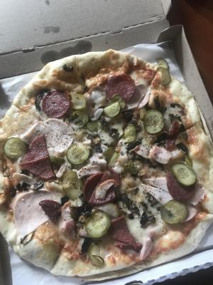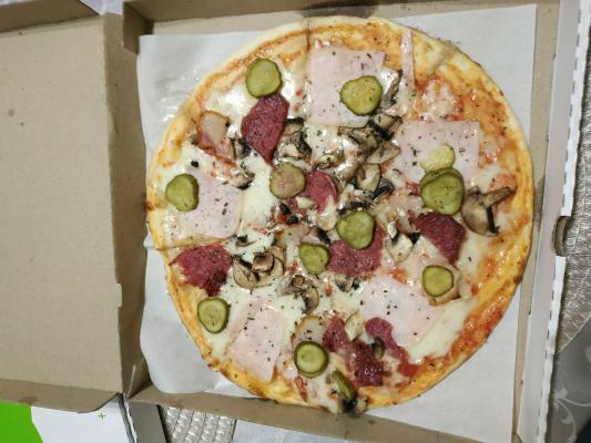 Состав: тесто дрожжевое, соус для пиццы, сыр моцарелла,  филей в/к, грудинка к/з, колбаса с/к, шампиньоны свежие, огурец маринованный, зелень