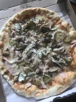 Состав: тесто дрожжевое, соус для пиццы, сыр моцарелла, говядина вырезка, филей в/к, свинина вырезка, огурцы маринованные, соус фирменный, зелень
