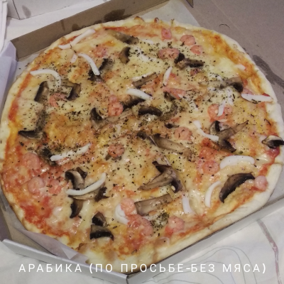 1-я: Из пиццы "Арабика" попросили убрать мясо и, по возможности, заменить входящими в рецепт креветками и кальмарами.