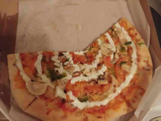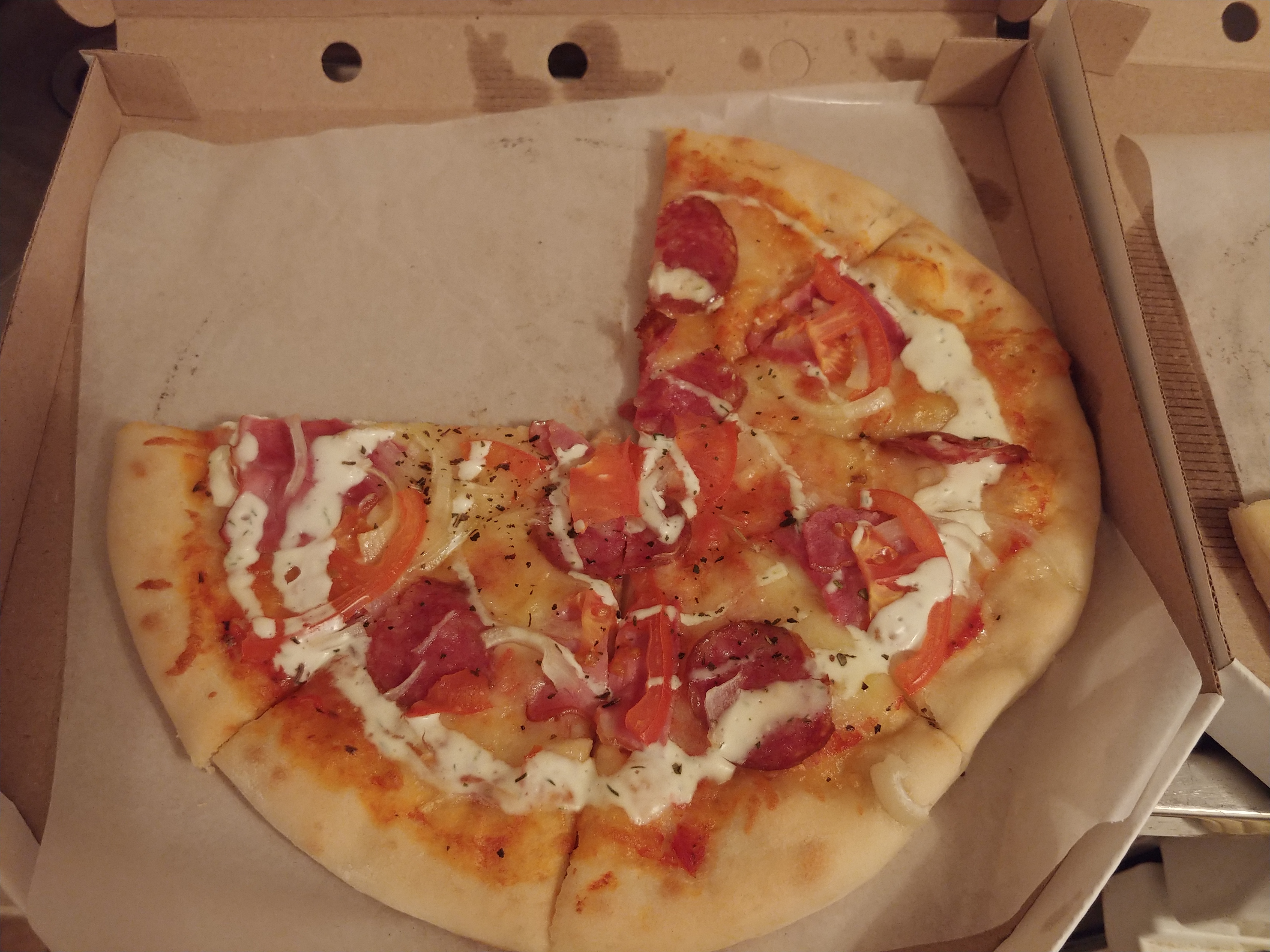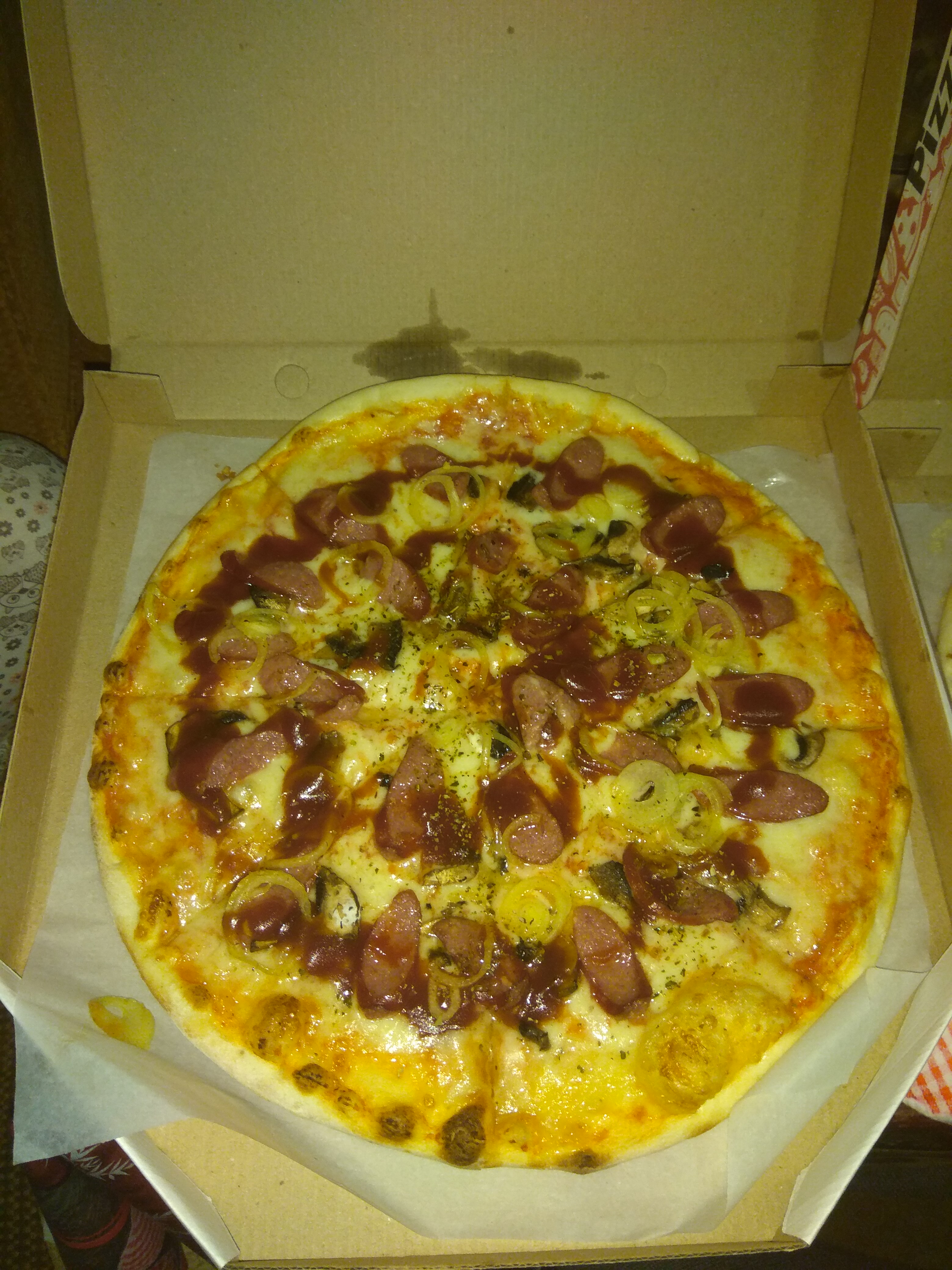 Состав: тесто дрожжевое ,соус для пиццы, масло чесночное, сыр моцарелла, свинина вырезка, шампиньоны, филе куриное ,лук, соус фирменный, маслины, оливки, зелень
