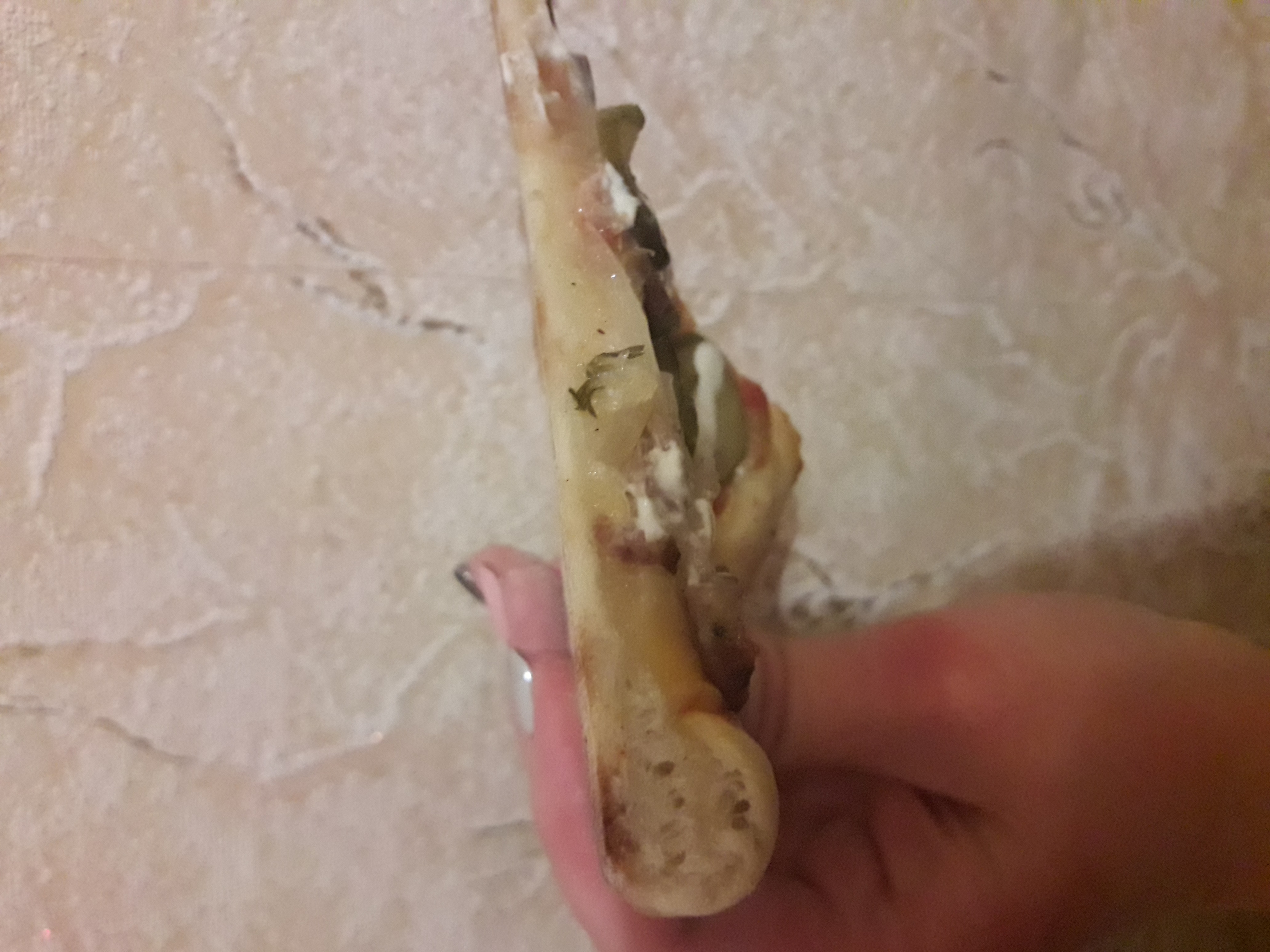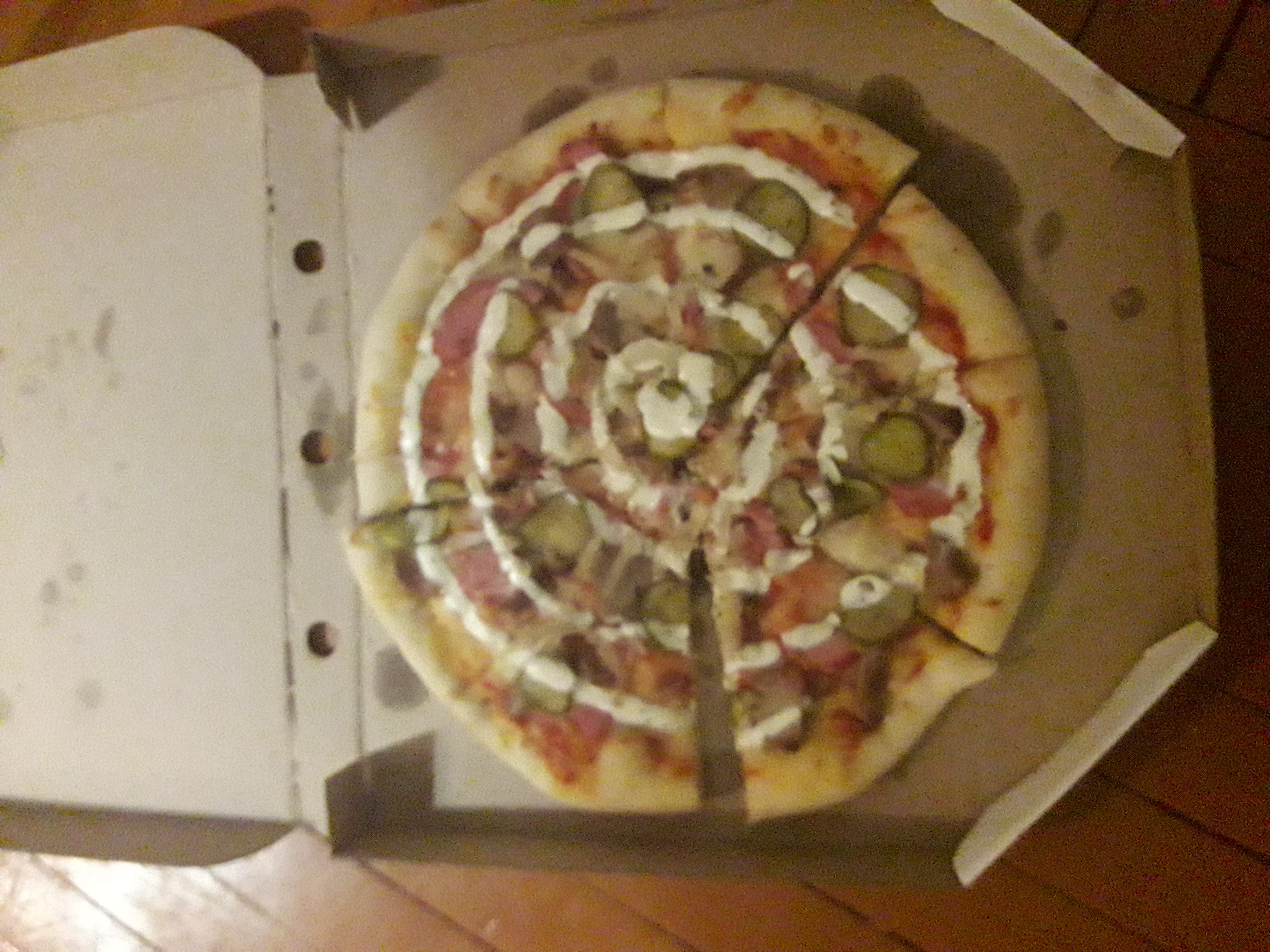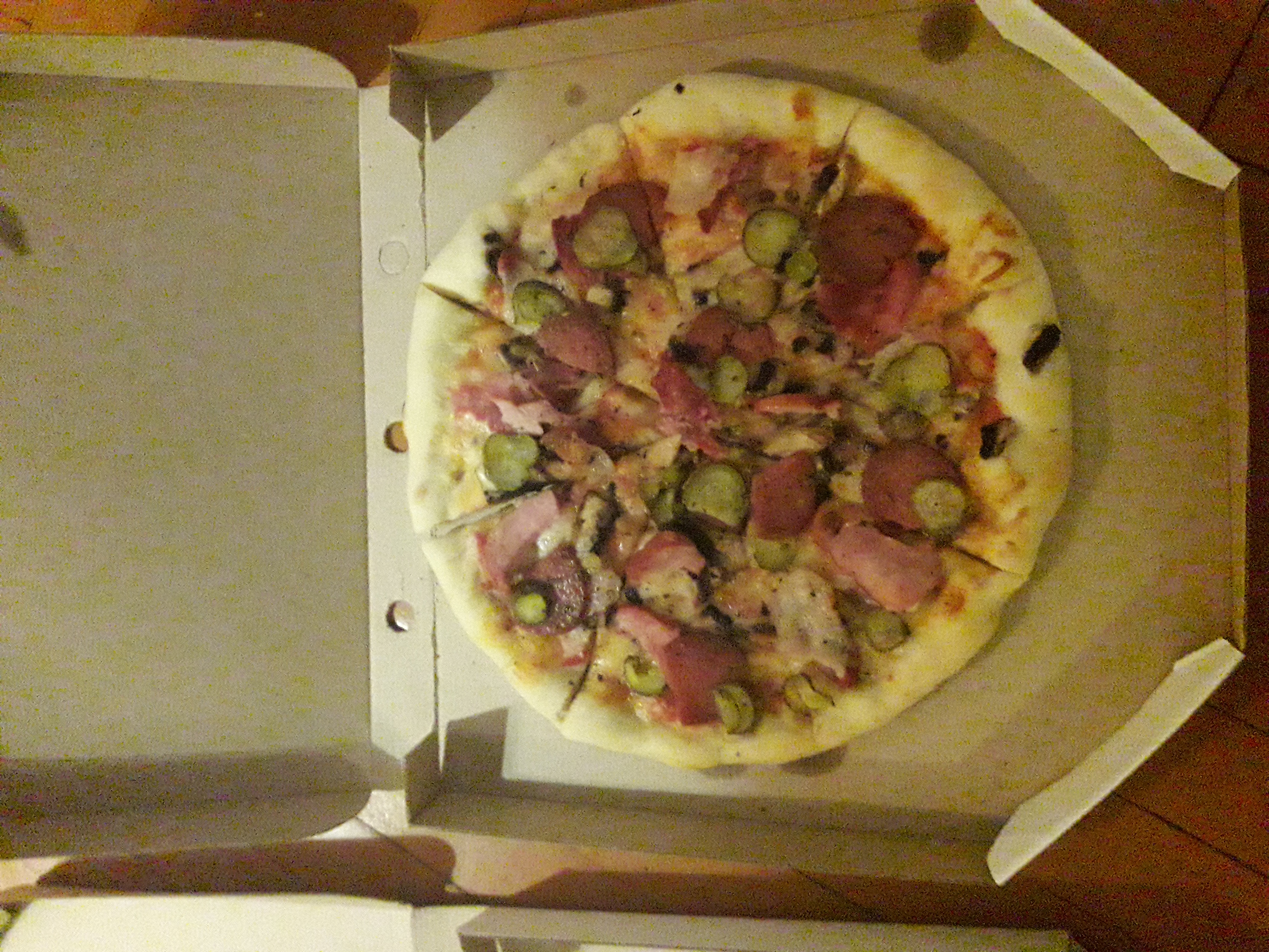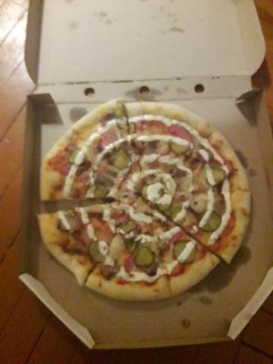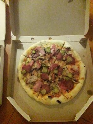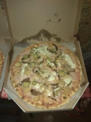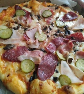 Состав: тесто дрожжевое, соус для пиццы, сыр моцарелла, филей в/к, грудинка к/з, колбаса с/к, шампиньоны свежие, огурец маринованный, зелень