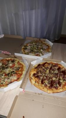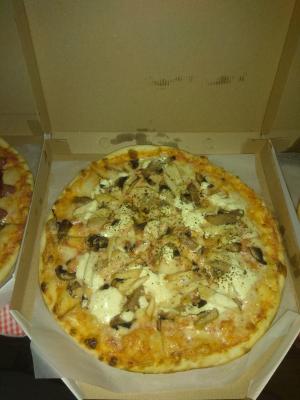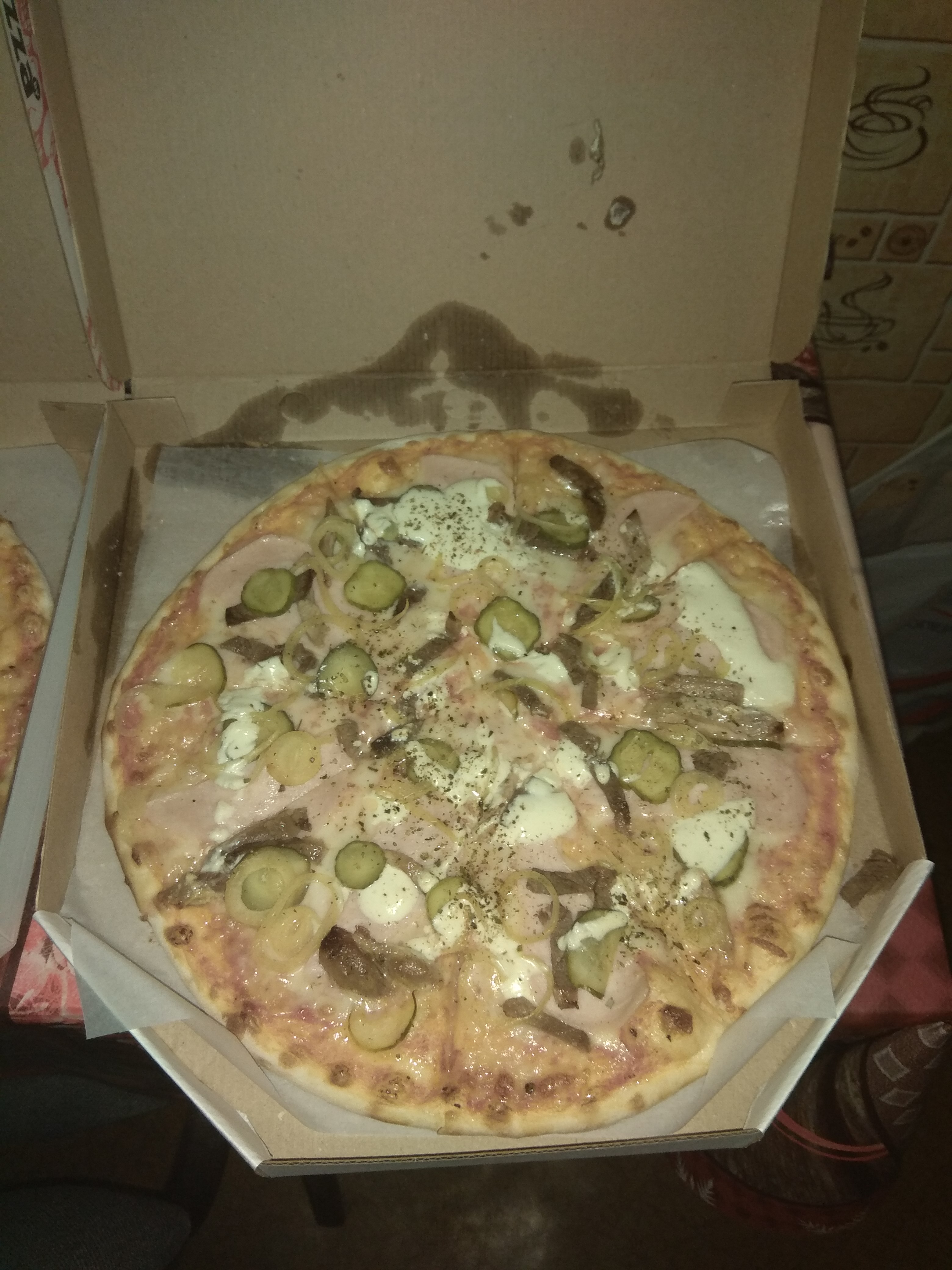 Состав: тесто для пиццы, сыр моцарелла, соус для пиццы, филе куриное, шампиньон свежий, филей в/к, огурец маринованный, соус соевый, маслины, оливки, зелень