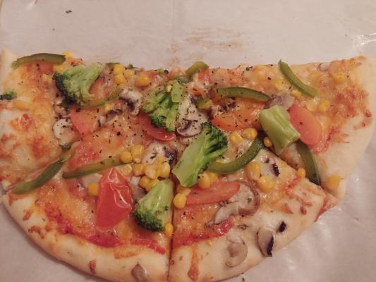 Состав: тесто дрожжевое, соус для пиццы, сыр моцарелла, кукуруза, томаты, перец сладкий, баклажаны, шампиньон свежий, маслины, оливки, зелень