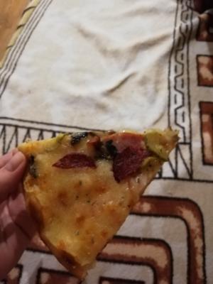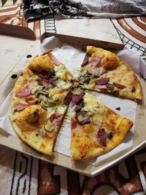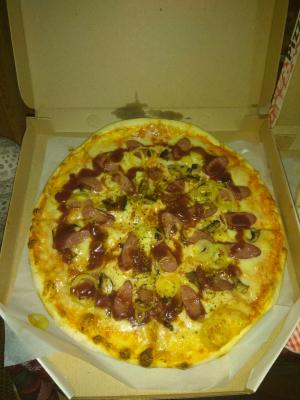 Состав: тесто для пиццы, сыр моцарелла, соус для пиццы, вилей в/к, грудинка к/з, колбаса с/к, шампиньон свежий, огурец маринованный, маслины, оливки, зелень