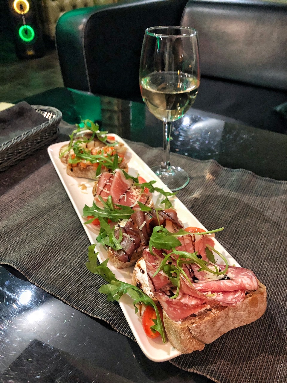 - ассорти брускетт: чиабатта, сыр (креметте, пармезан), говядина с/к, пармская ветчина, салями, лосось, анчоусы, руккола, черри (285/40)