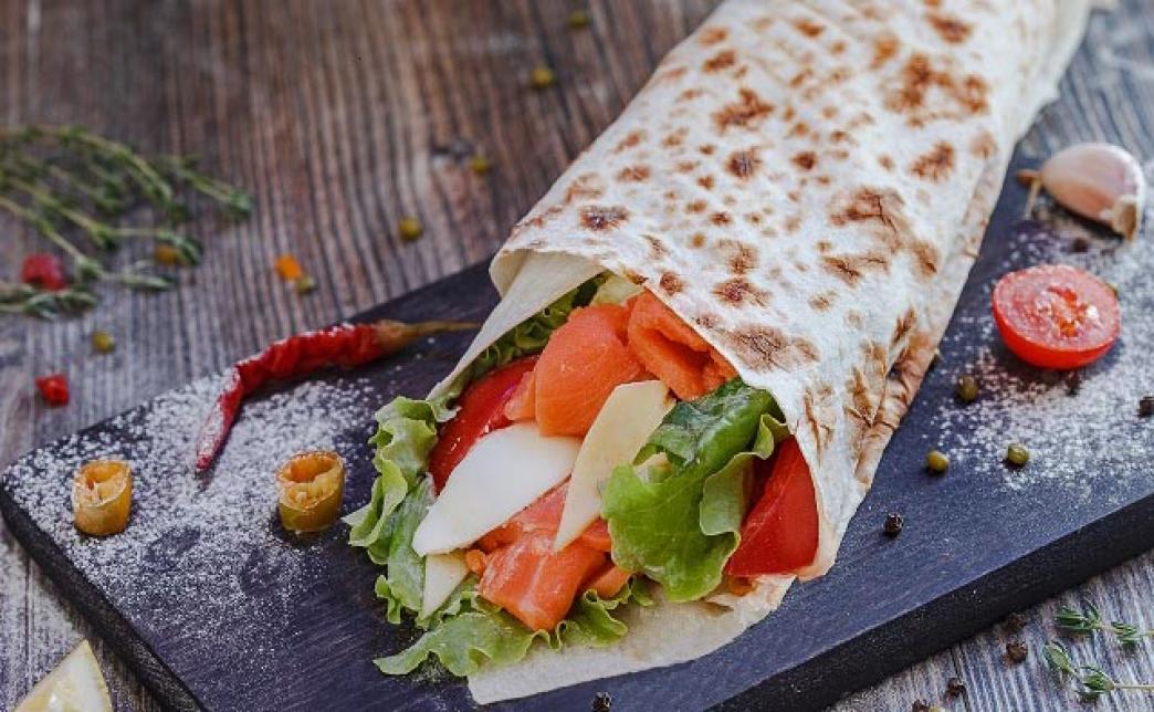Лаваш, сёмга слабосолёная, соус цезарь "по-грузински", томат, сыр, яйцо, салат.
