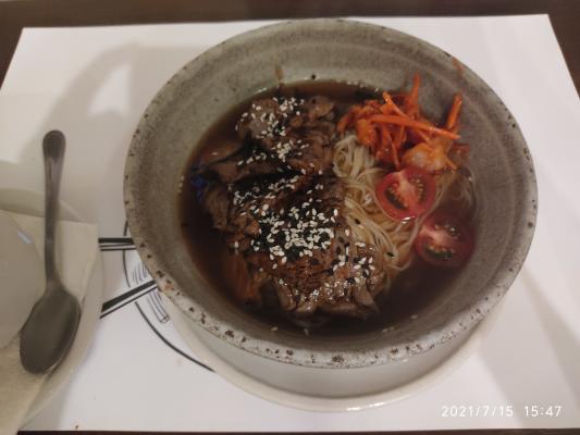 Состав: яичная лапша, говядина, томат, говяжий бульон, капуста кимчи, соус терияки, кунжут