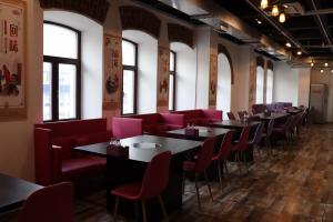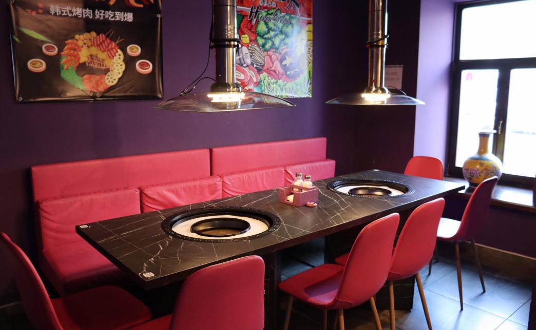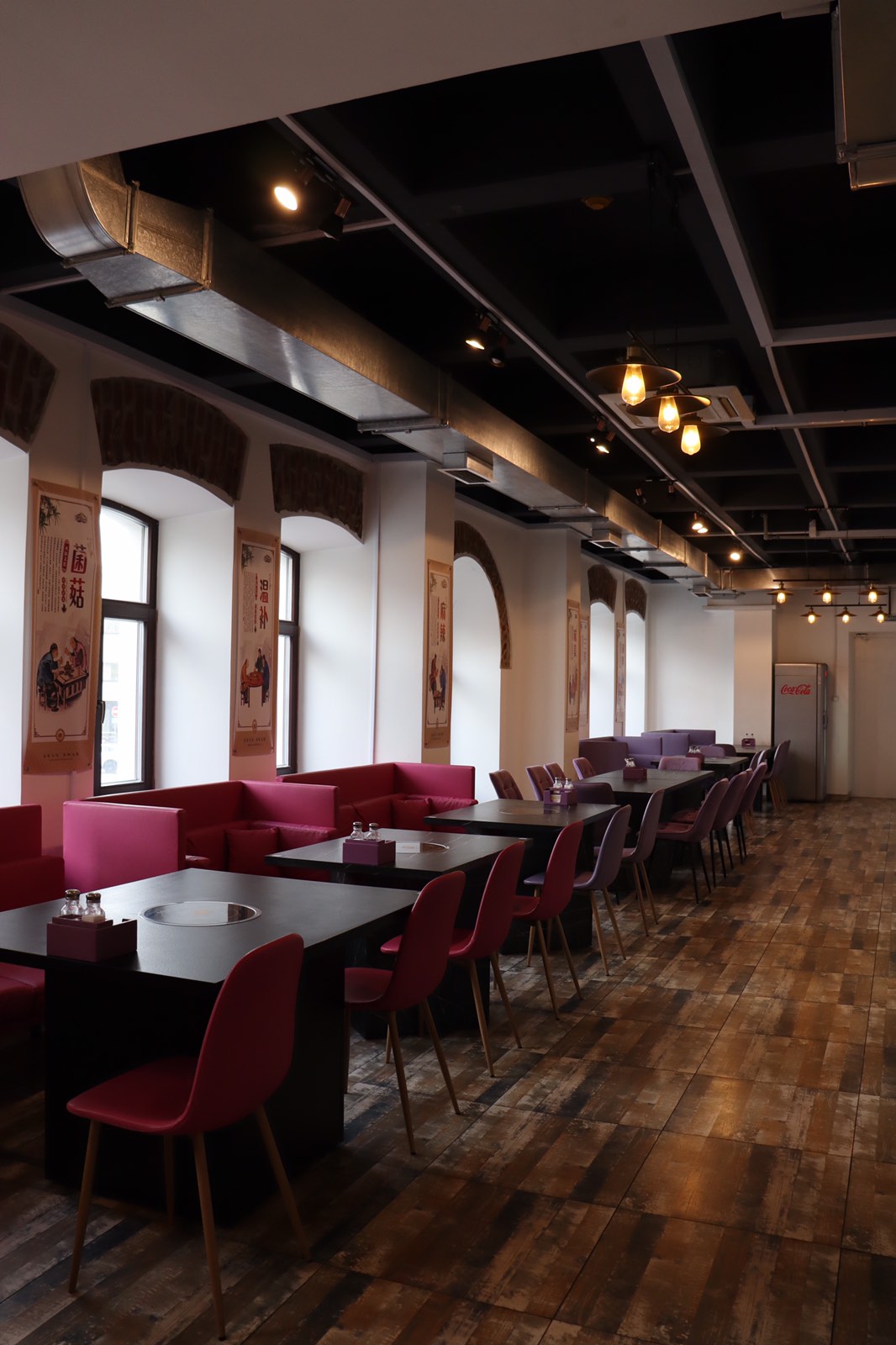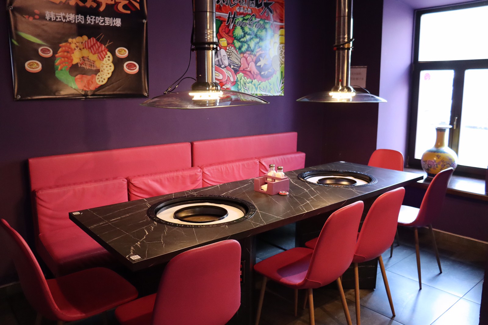 На втором этаже просторный зал с караоке. На первом в каждый стол встроен гриль на котором варят хого - китайский самовар, а чуть позже жарят на нем мясо с овощами.