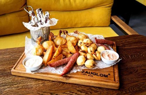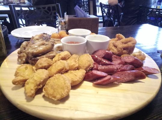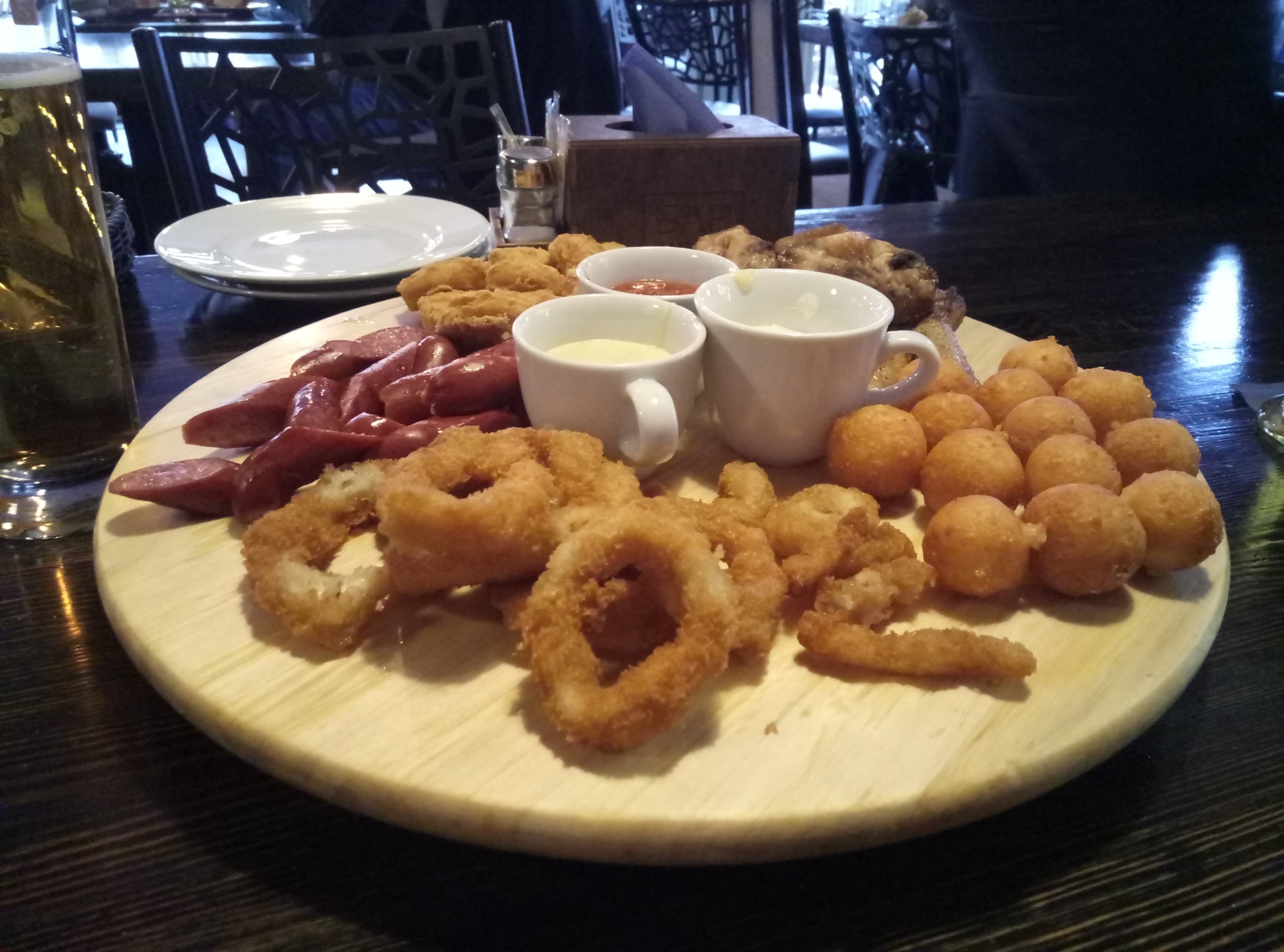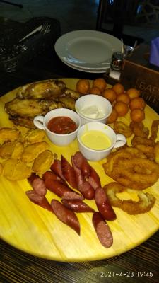 Состав: колбаски, картофельные чипсы, начос, луковые кольца, сухарики. Подается с тремя соусами: BBQ, горчичный, рэнч