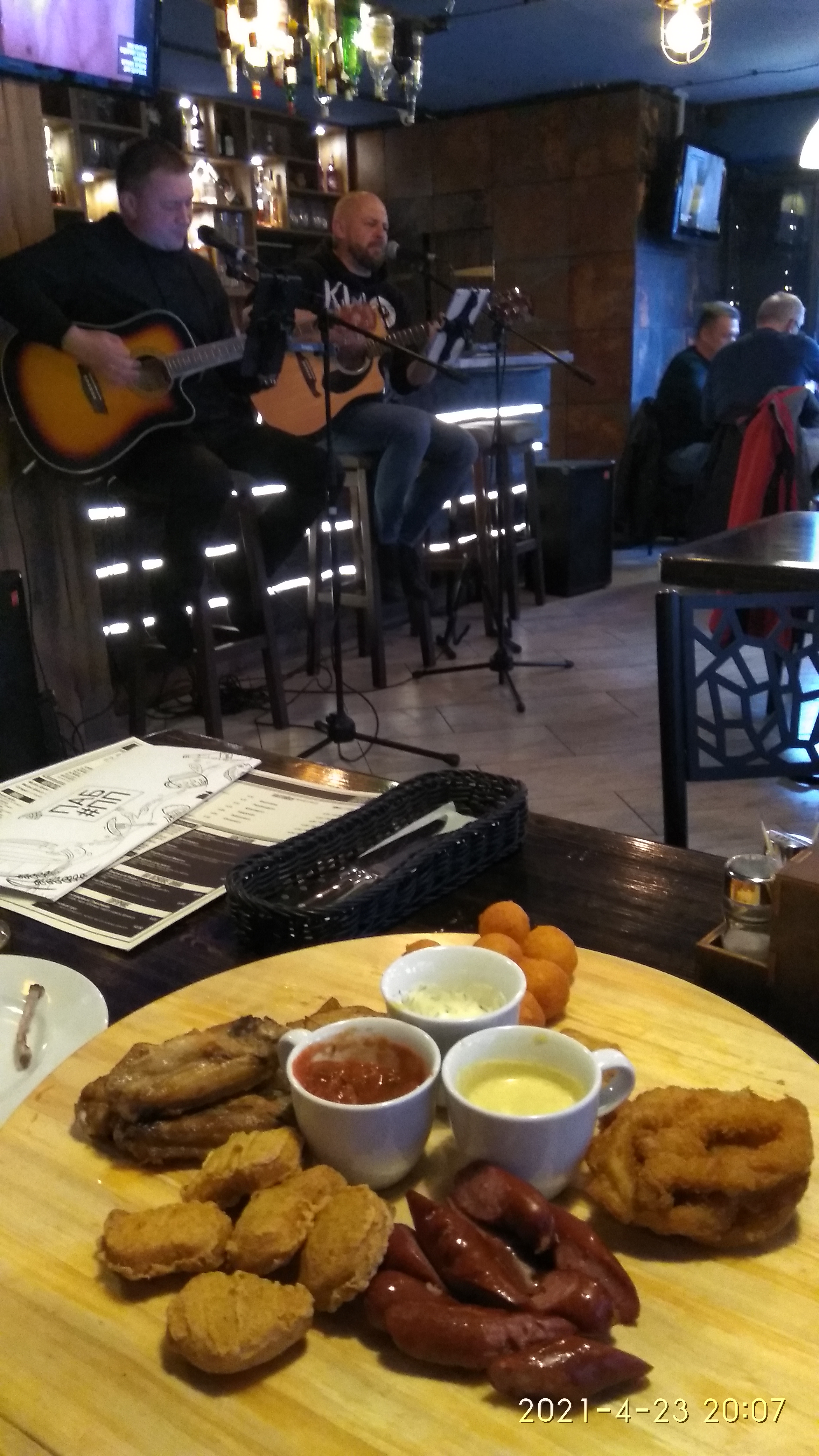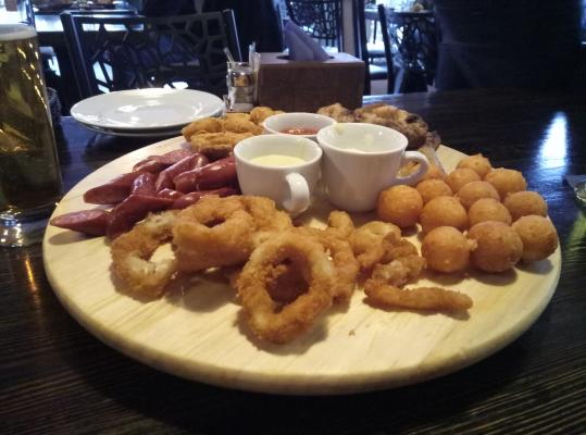 Состав: колбаски, наггетсы, куриные крылышки, кольца кальмаров в кляре, сырные шарики. Подается с тремя соусами: BBQ, горчичный, рэнч