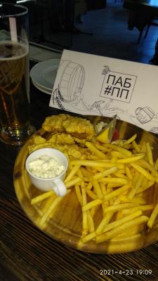 Состав: филе трески в хрустящей золотистой корочке с картофелем фри и соусом тар-тар