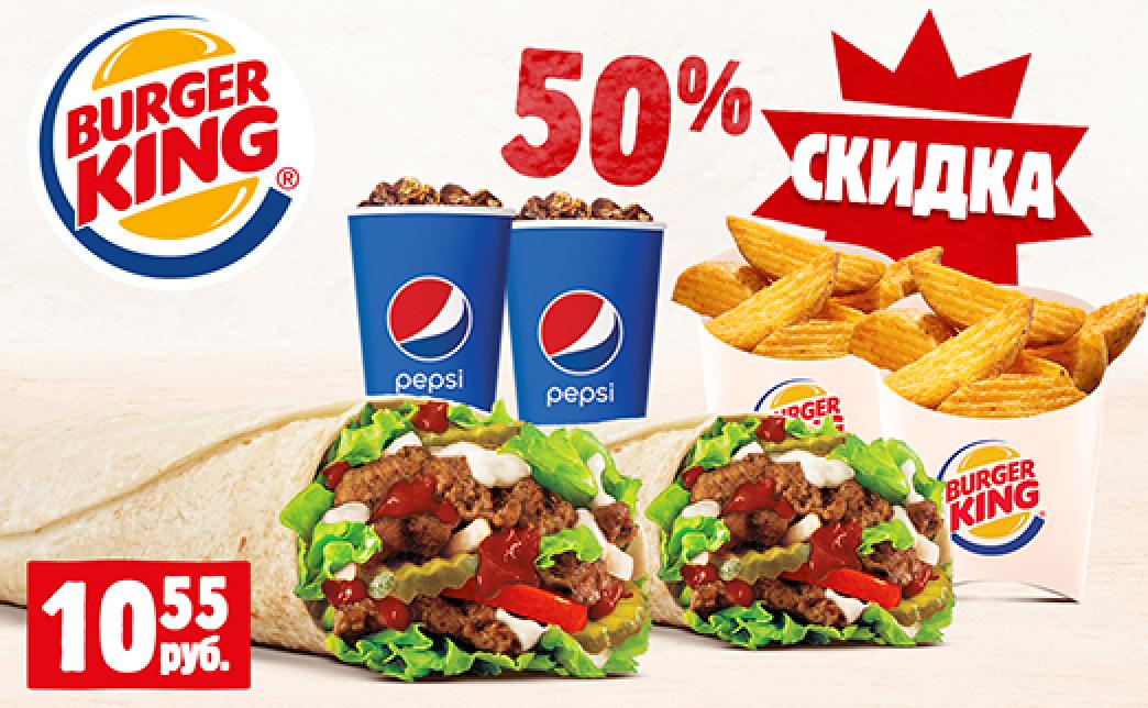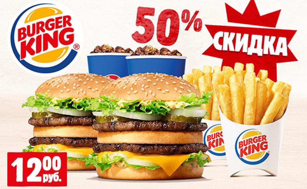 - Промокод дает право на скидку до 53% на 2 сета в ресторанах "Burger King".