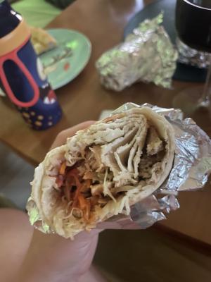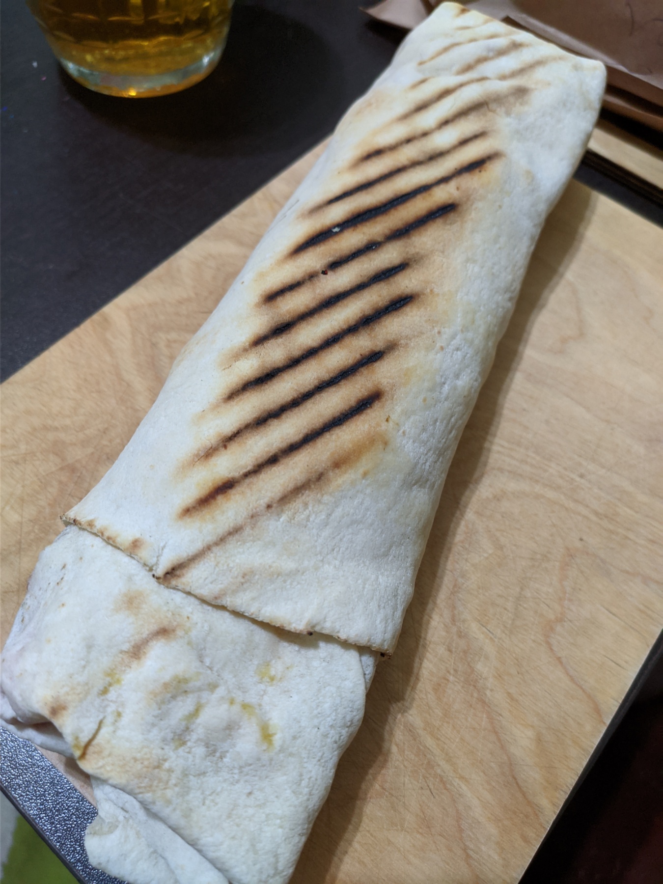 Состав: пита, курица, грибы, помидор, соленый огурец, картофельные дольки, соус чесночный