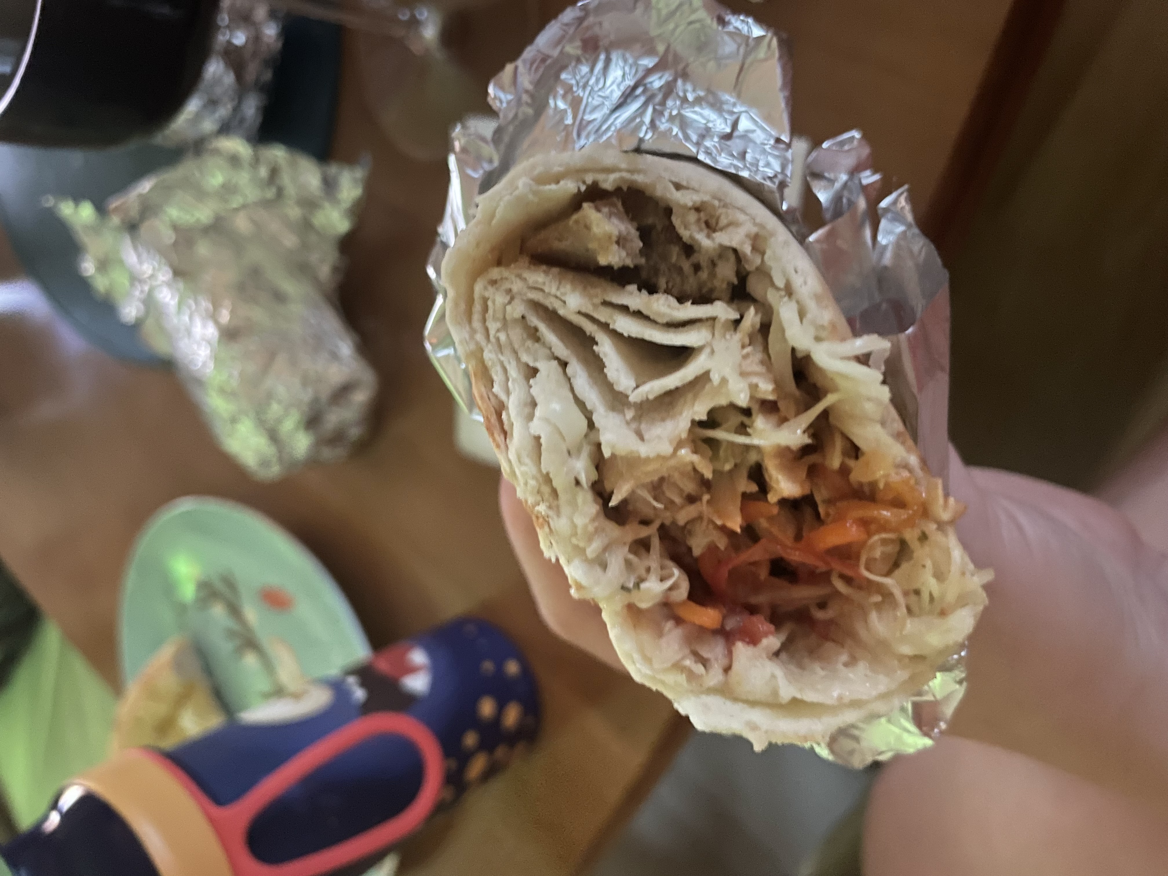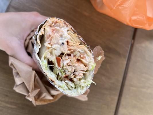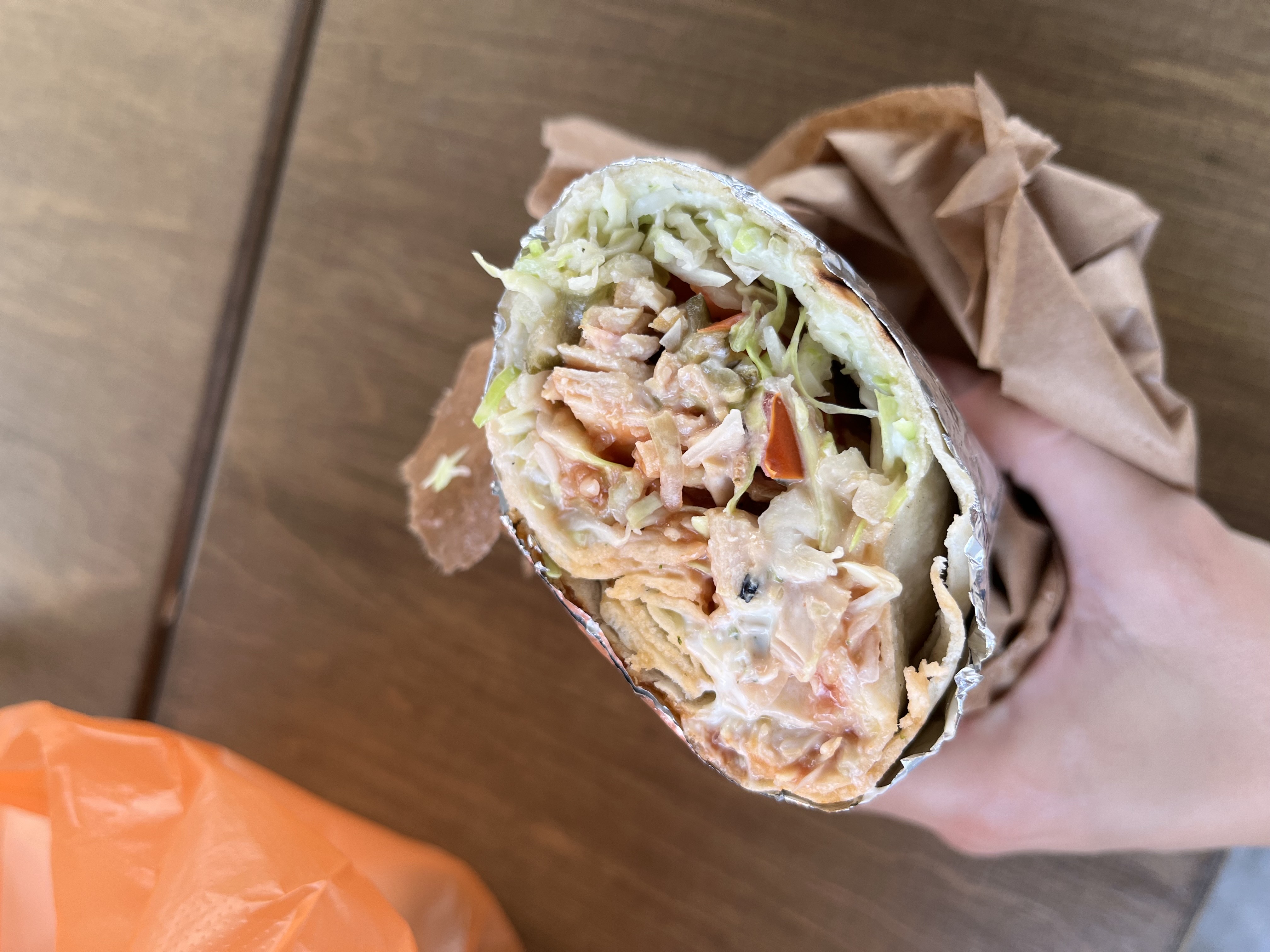 Состав: курица, капуста, маринованный огурец, морковь по-корейски, помидор, секретный соус, соус чесночный