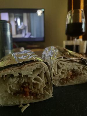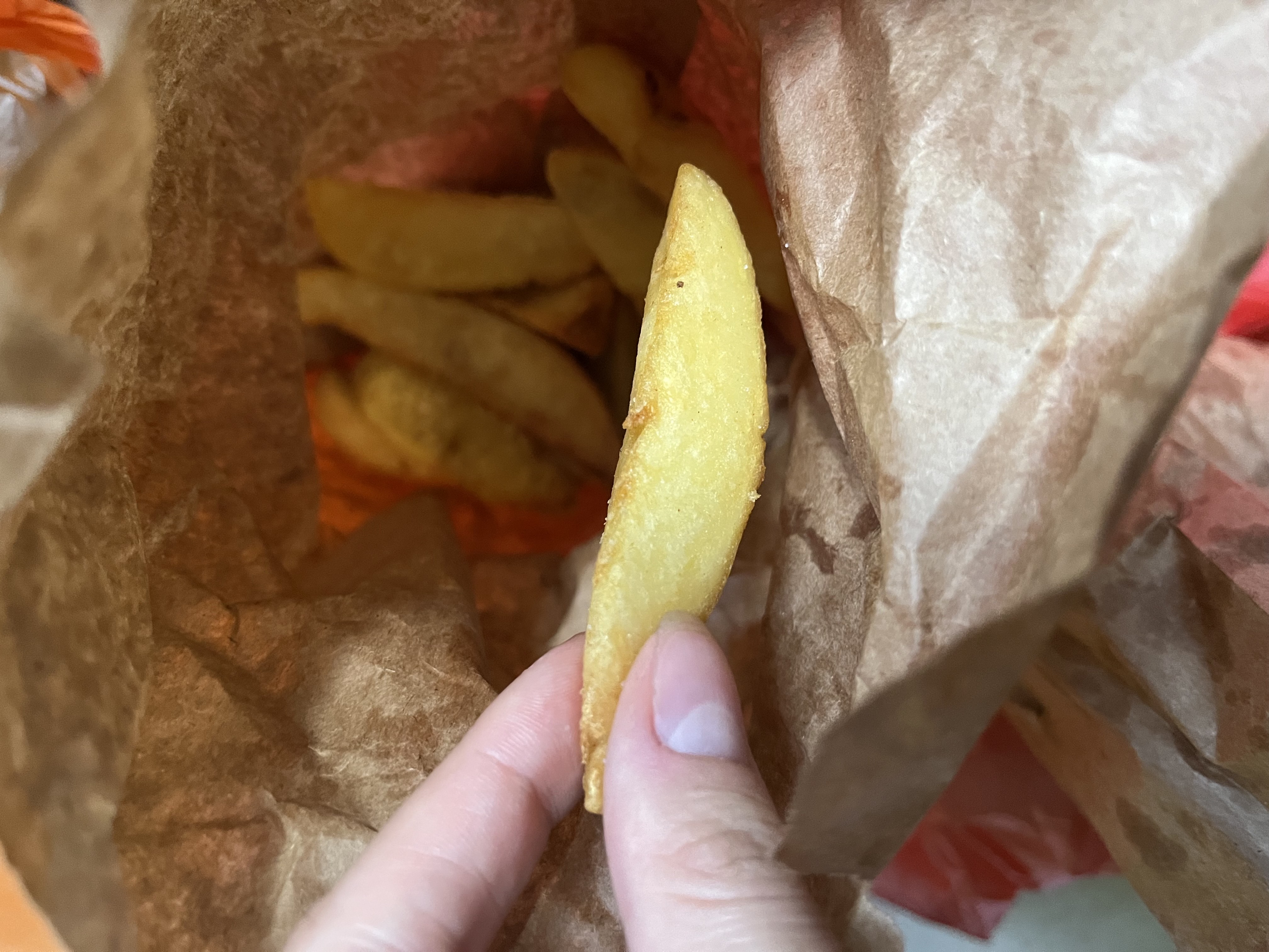 Состав: пита, курица, картофель фри, соленый огурец, помидор, соус барбекю