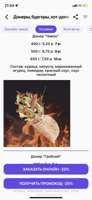 - Промокод дает право на скидку 25% на донеры, бургеры, хот-доги, блины в кафе "Донер Сити"