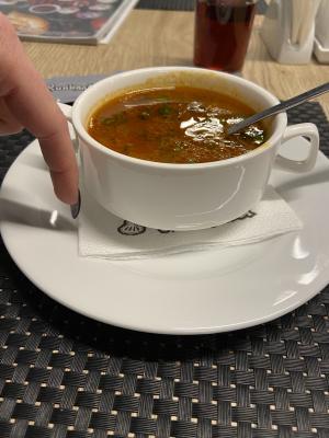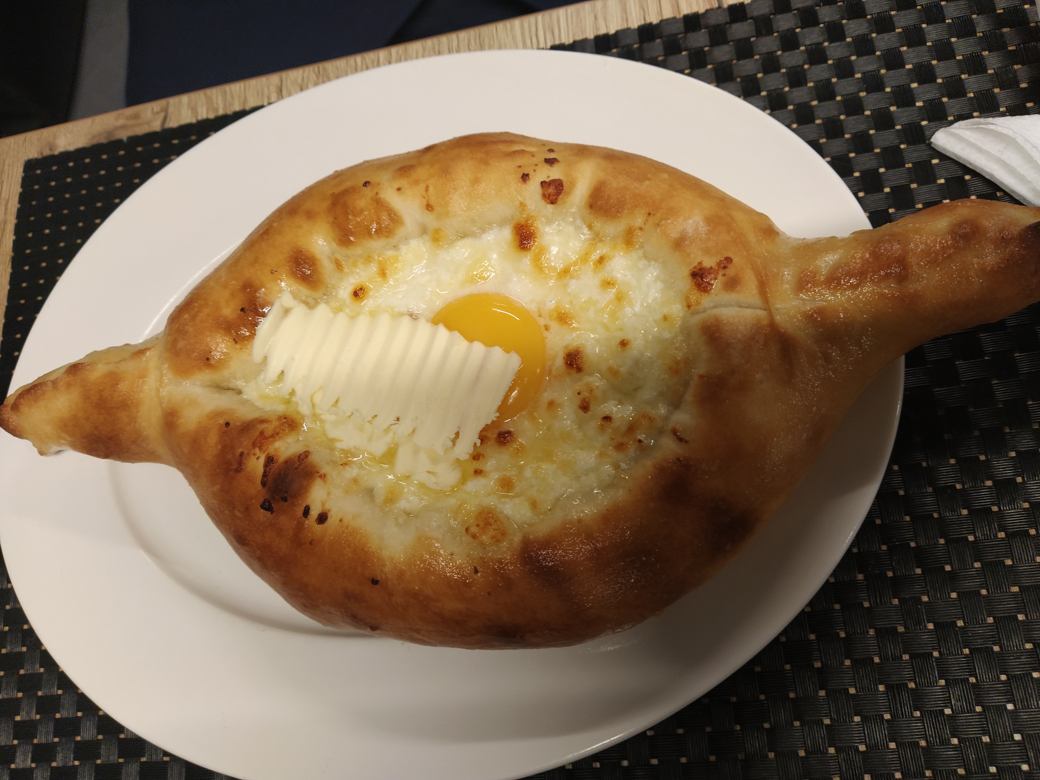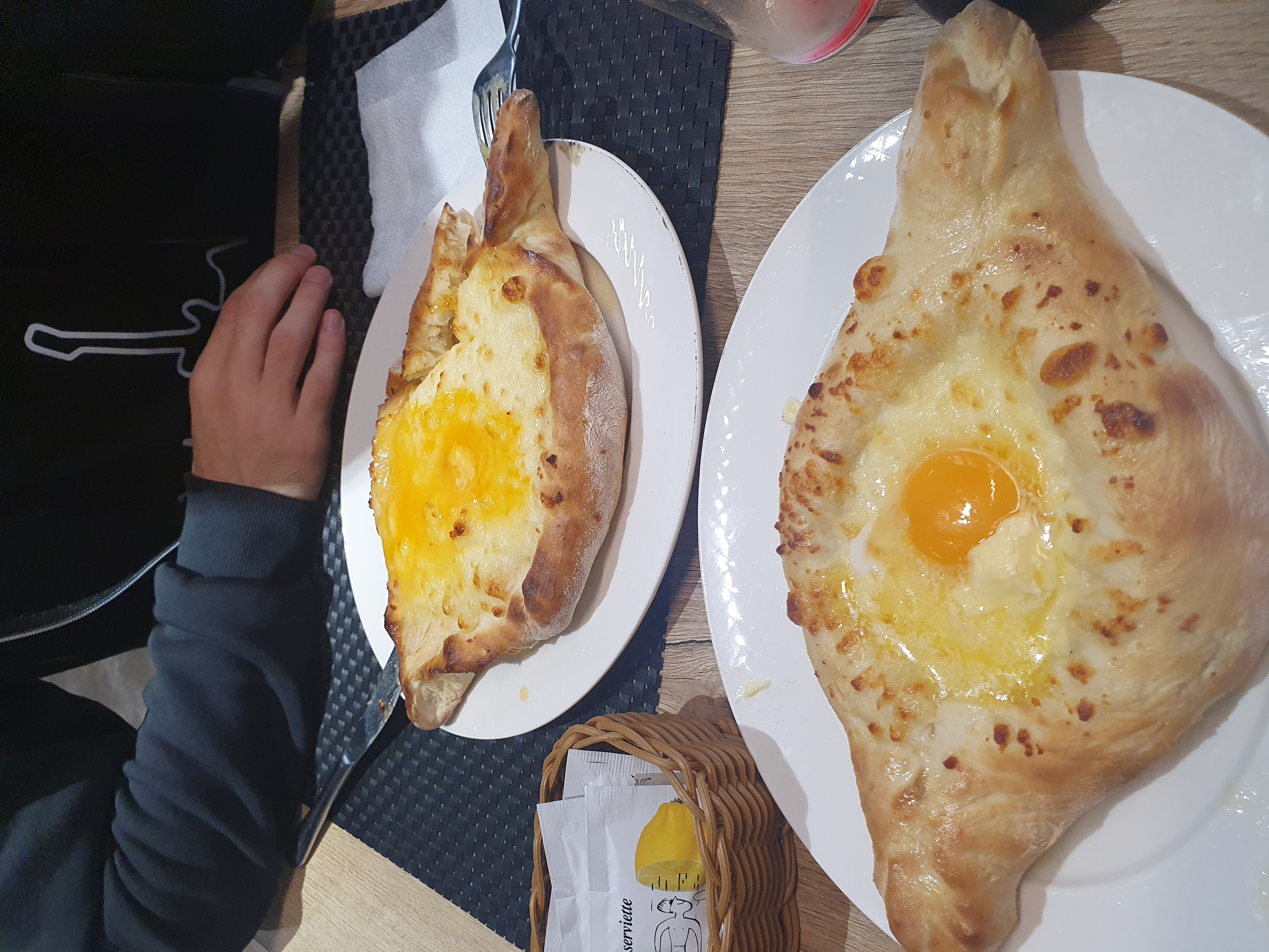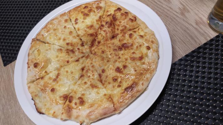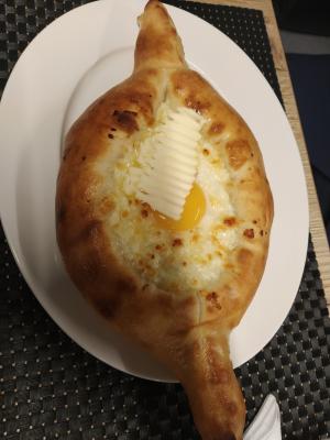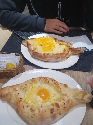 Заказывали цезарь,хачапури,харчо,удивило то,что принесли один хачапури,но они настолько разные были,один был полностью в сыре,а второй только в серединке и немного. Удивила неприятно такая разница.А цезарь вкусный и огромная порция.