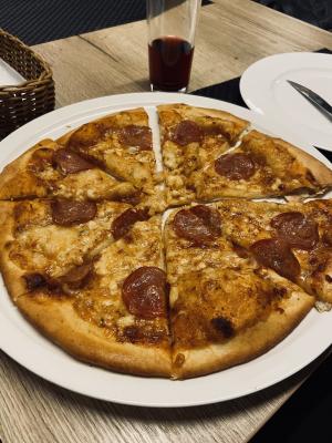 Еда проста отвратительная , жирный-жир это все блюда в этом заведении , а на десерт хинкали с сырым мясом внутри 🤮 Пицца совершенно не соответствует картинке и утопает в жире , пиццу сложно испортить , но тут это сделать смогли! 🤬