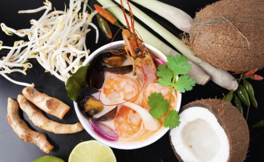 Состав: кокосовое молоко, креветки, листья кафир-лайма, лемонграсс, галангал, томат черри, ананас