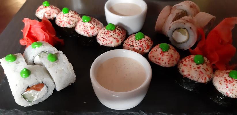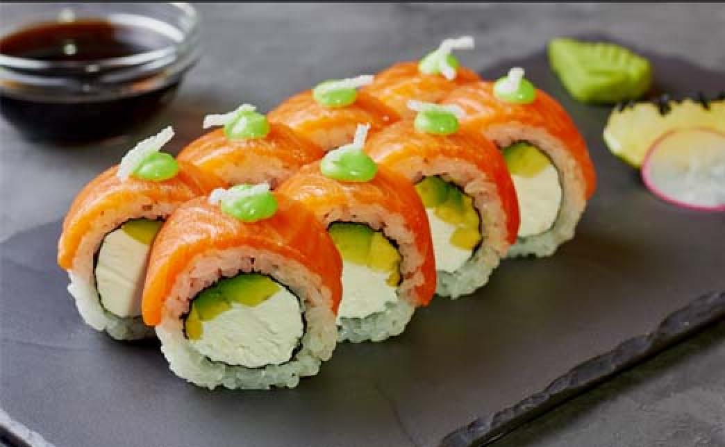 Рис, нори, лосось, авокадо, сыр Креметта, салат Чука, соус Ореховый