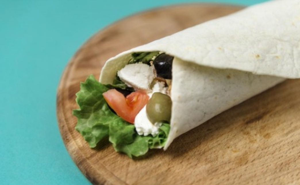 Нежный ролл в тортилье с сыром кремчиз, свежими томатами и огурцами, хрустящим салатом айсберг, оливками, маслинами, заправленный йогуртовым соусом с оливковым маслом и лимонным соком (280 г).