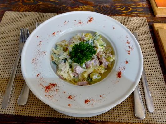 - салат "Ковчег" (250 г, 1 порция): салат айсберг, обжаренная говядина с шампиньонами, томат, огурец соленный, сыр сулугуни, майонез, зелень
