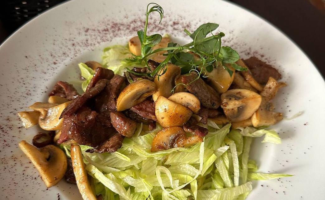 - салат "Ковчег" (250 г, 1 порция): салат айсберг, обжаренная говядина с шампиньонами, томат, огурец соленный, сыр сулугуни, майонез, зелень