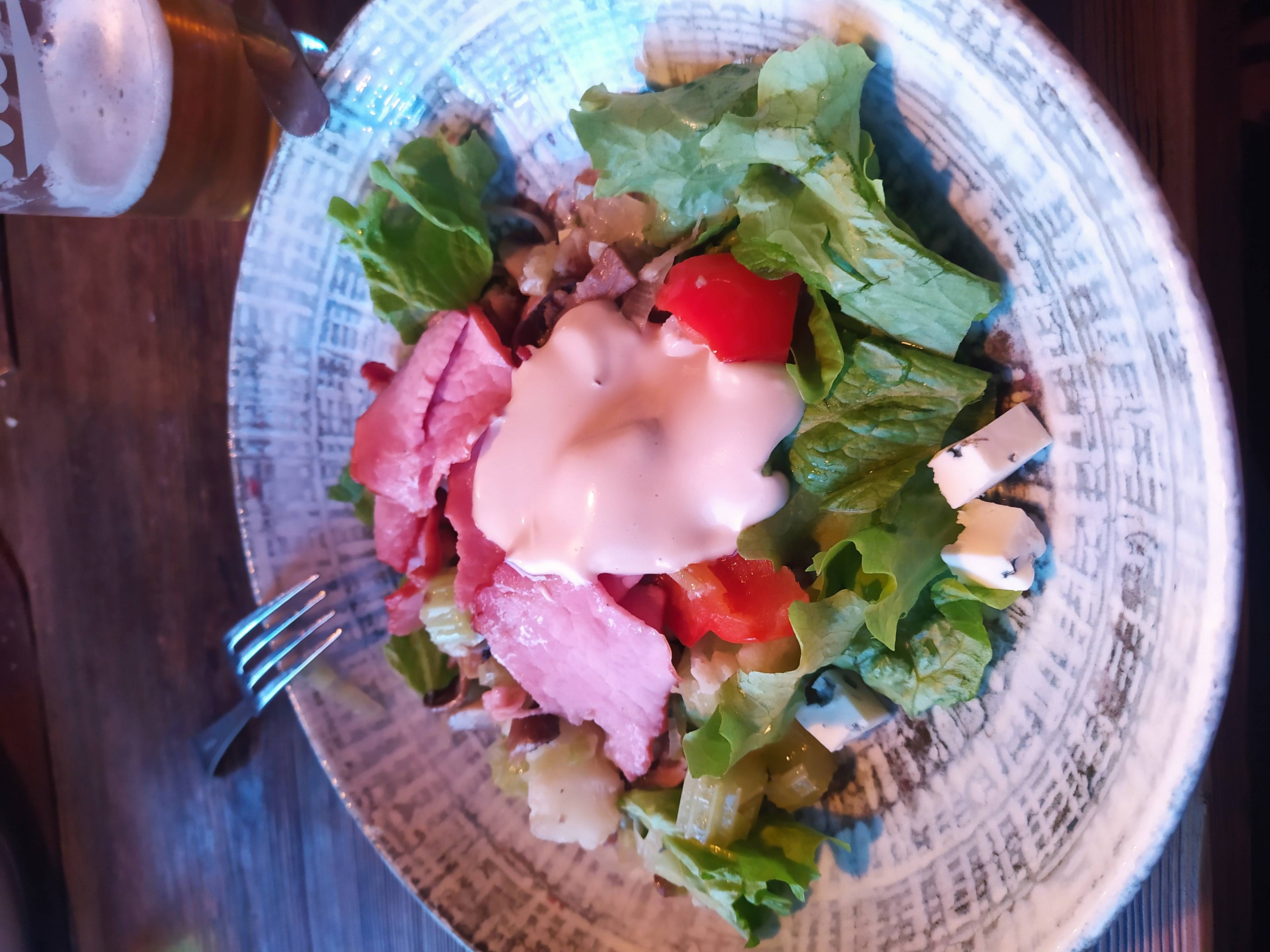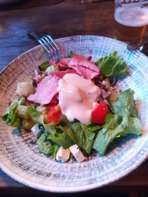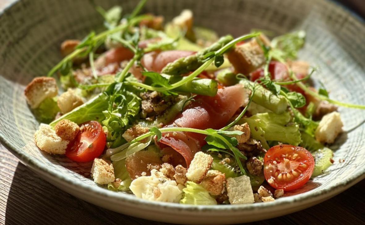 - легкий салат с пармской ветчиной и сыром Дор Блю: парма, киви, томаты черри, спаржа, сыр Дор Блю, грецкий орех, микс салата, соус Юдзу (180 г)