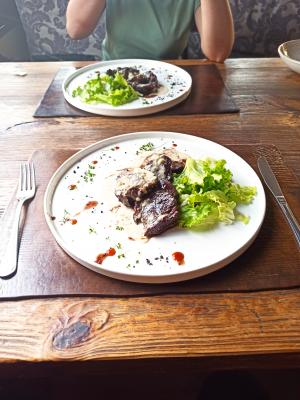 - ужин №1 (медальоны из говядины с соусом Демиглас и ризотто с трюфельной пастой + легкий салат с пармской ветчиной и сыром Дор Блю:): 35 р. 70 р.