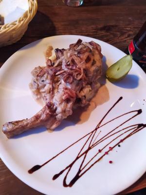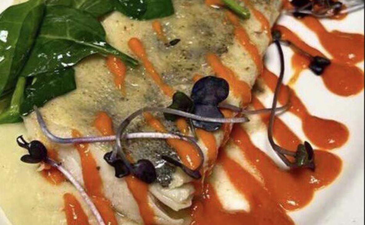 - филе судака на подушке из овощного пюре: филе судака, овощное пюре, перечный соус, свежий шпинат (280 г)