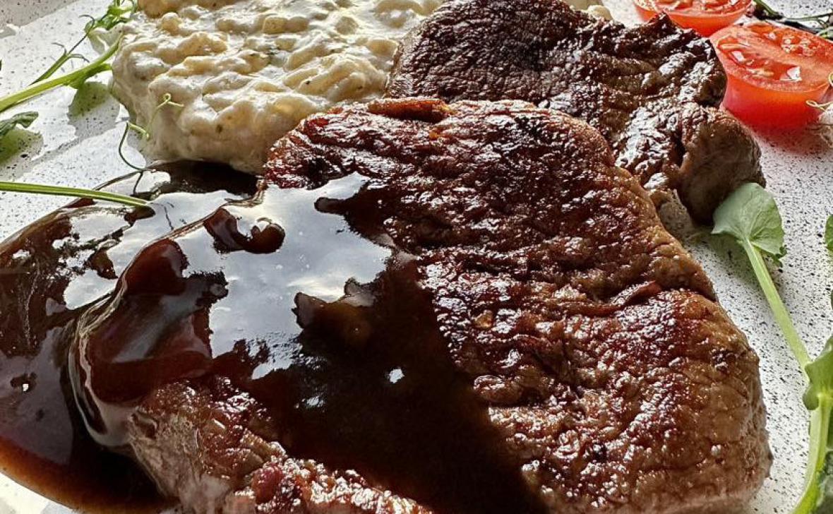 - медальоны из молодой говядины с соусом Демиглас и ризотто с трюфельной пастой (223 г)