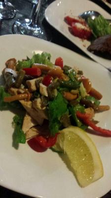 - филе судака на подушке из овощного пюре: филе судака, овощное пюре, перечный соус, свежий шпинат (280 г)