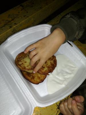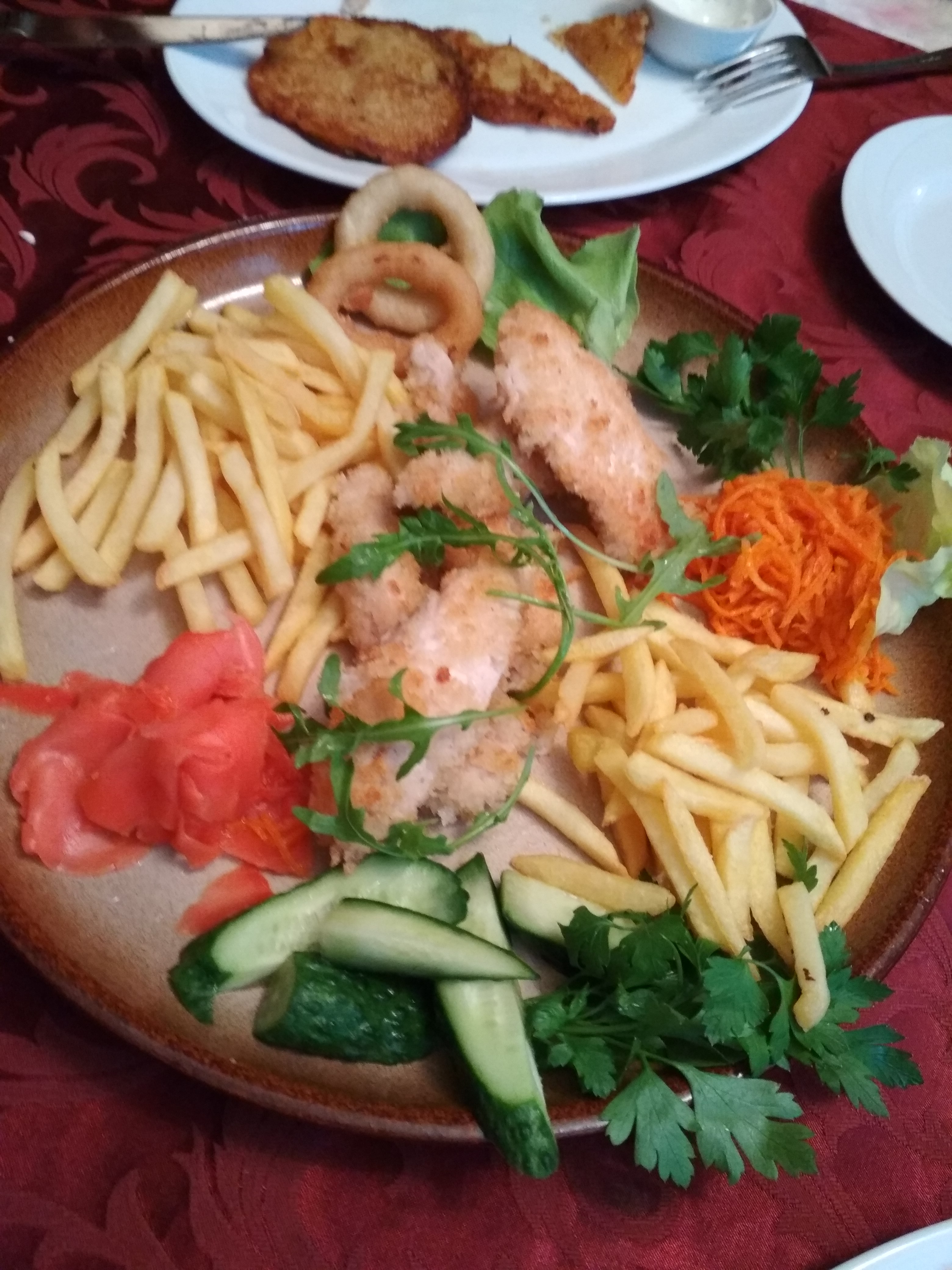 - котлета по-киевски с жареным картофелем (415 г): филе цыпленка, сухари панко, масло сливочное, картофель жареный, багет французский, томат свежий, огурец свежий, перец свежий, микс салатов