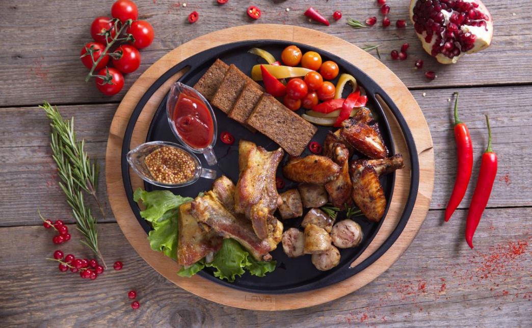 - сет мясной на гриле (870 г): ребра свиные, домашняя колбаса, куриные крылышки, маринованные овощи, кетчуп, горчица