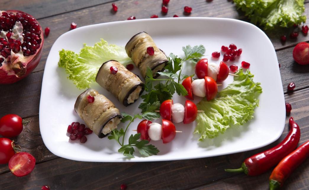 - рулетики из баклажан с томатами капрезе (305 г): рулетики из баклажанов с начинкой из сыра и грецкого ореха, томат-черри, моцарелла