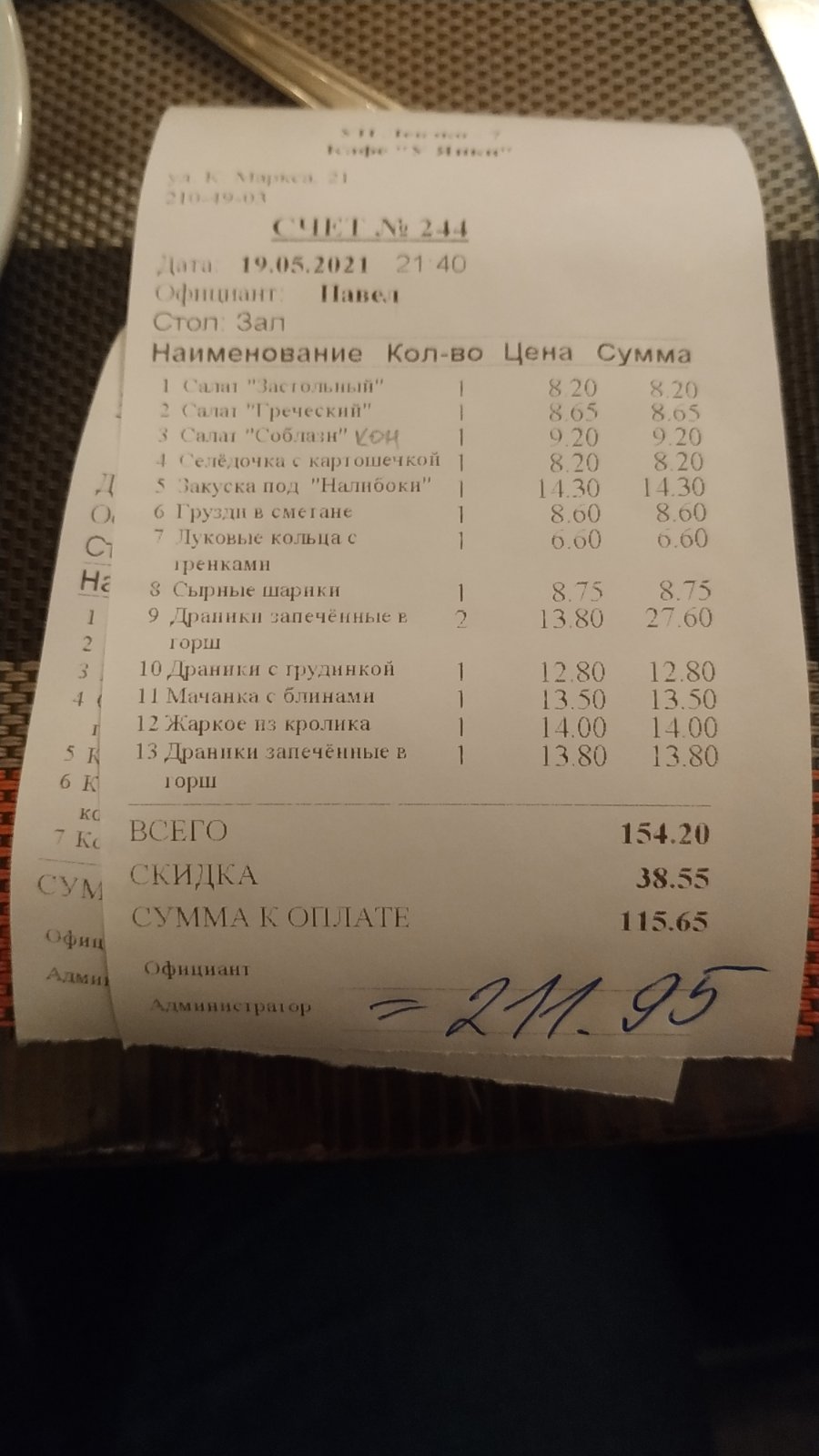 - Промокод дает право на скидку 50% на закуски к пенному напитку в зале кафе "У Янки"