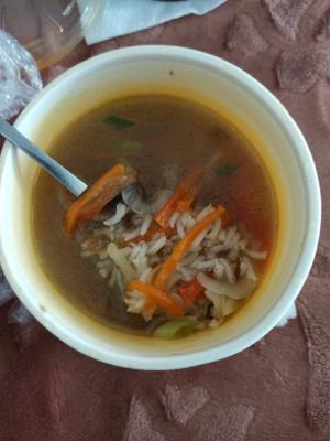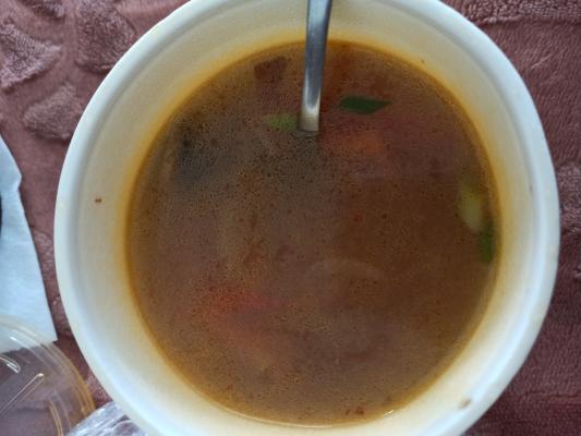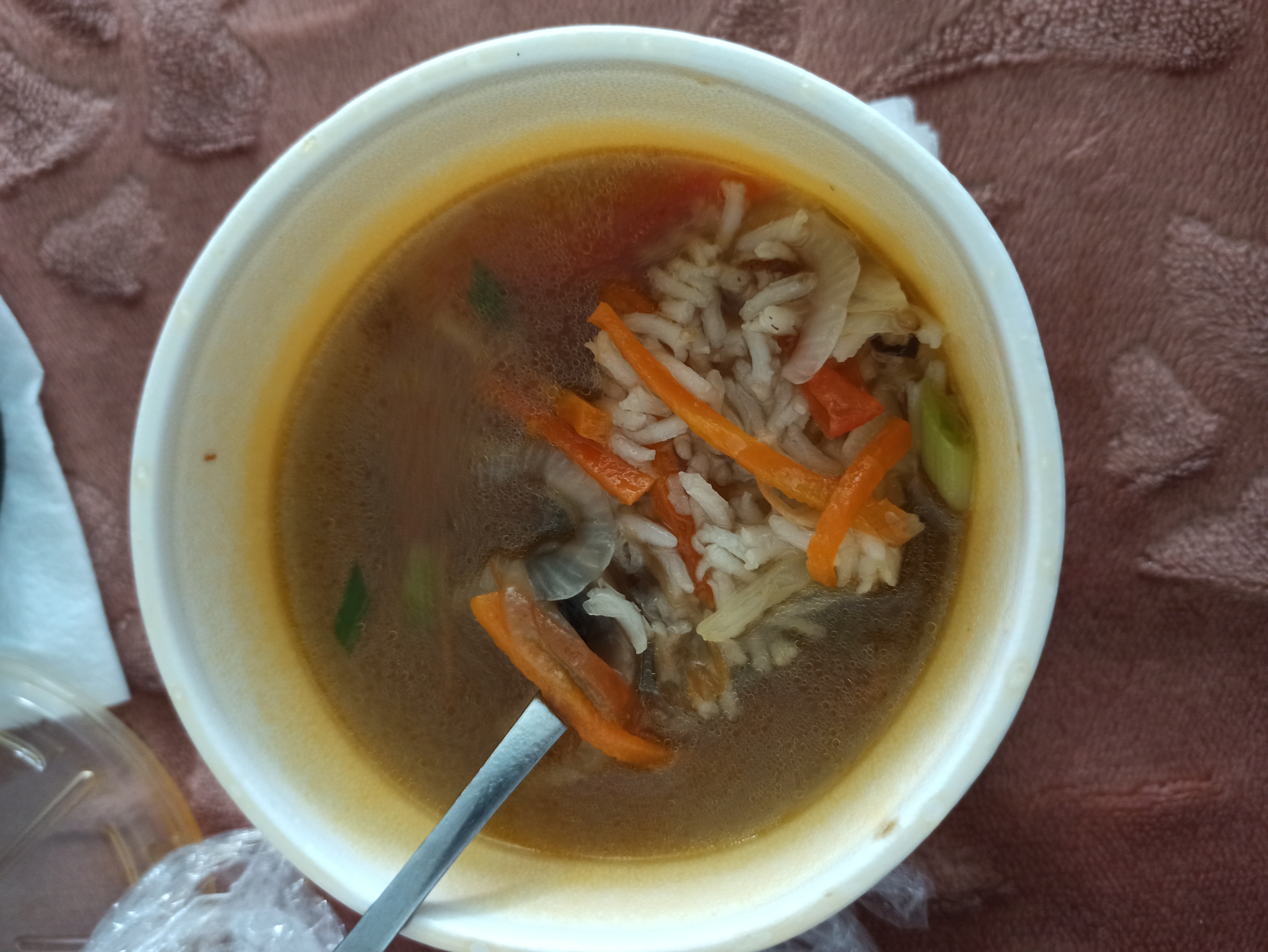 Состав: бульон куриный, паста острая, соус соевый, рис, креветка, зелень |