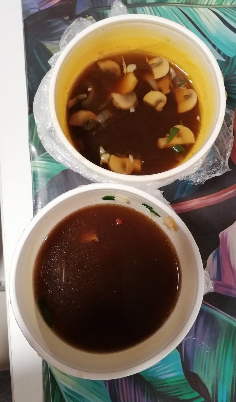 Состав: бульон куриный, соус соевый, соус рыбный, рис, креветки, шампиньон, лимон, лук, сок лайма, перец чили, зелень |